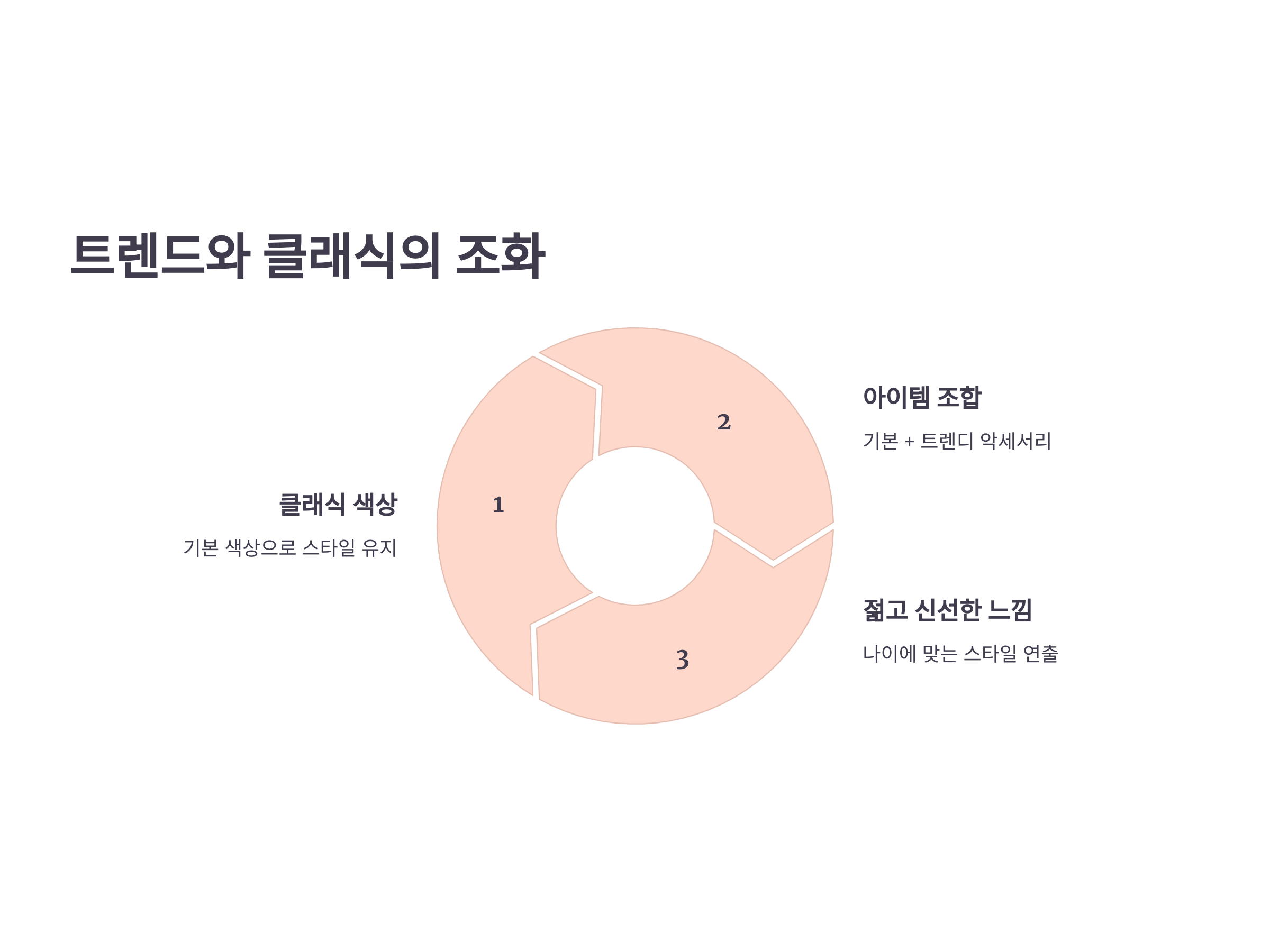 트렌드와 클래식 아이템을 잘 결합하면 젊고 신선한 느낌을 주면서도 나이에 맞는 스타일을 연출할 수 있습니다.