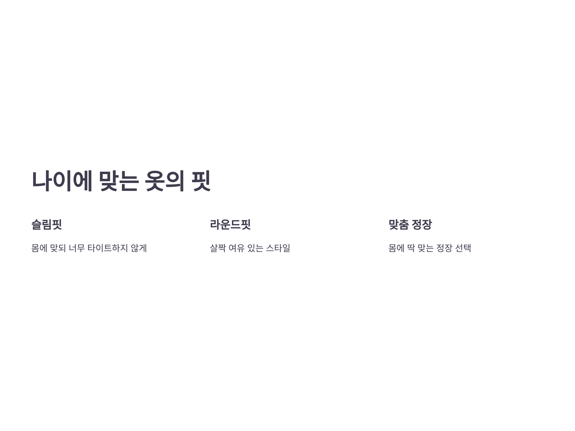적당한 핏을 선택하는 것만으로도 세련된 이미지를 만들 수 있습니다.