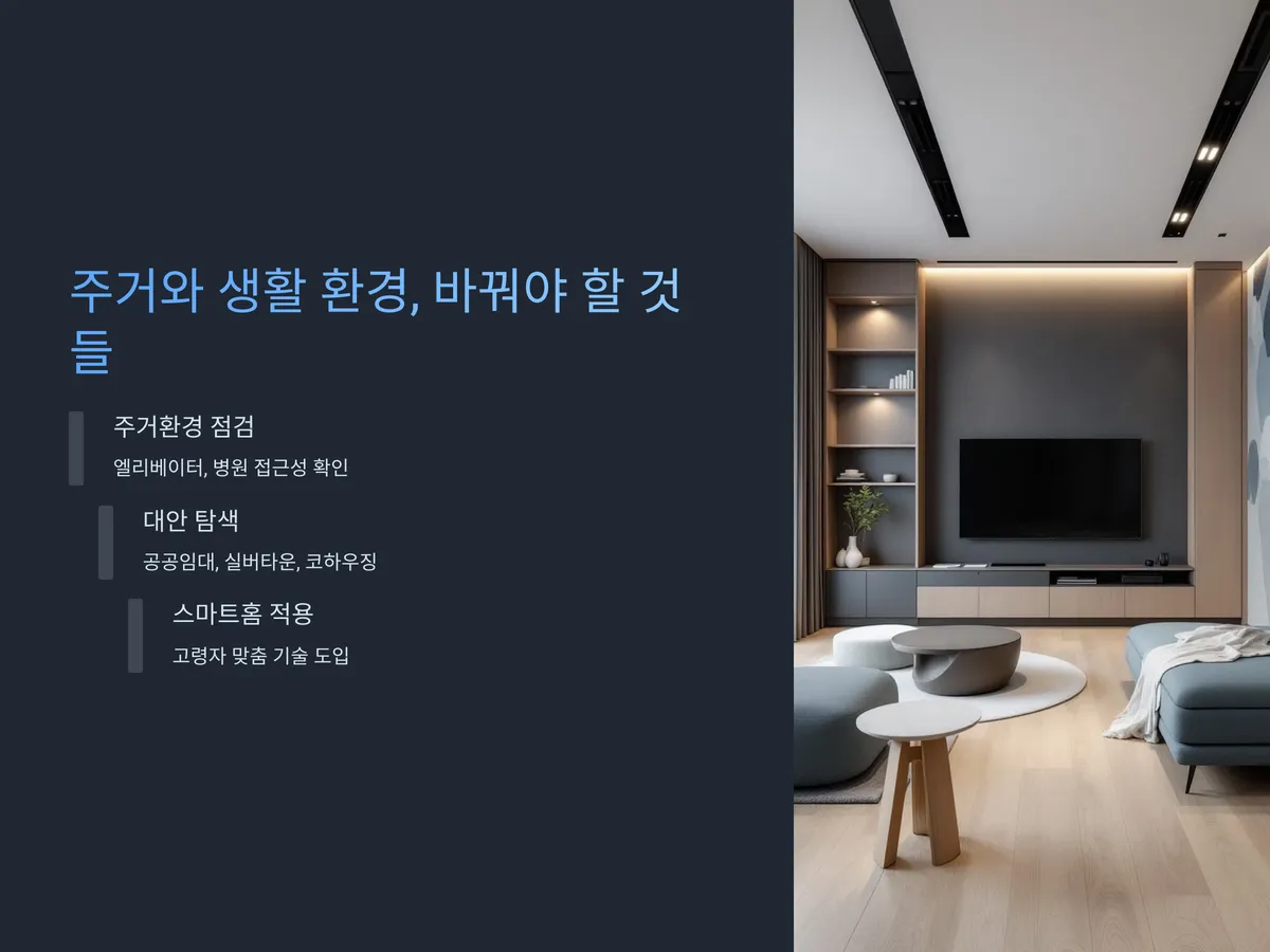 공공임대주택이나 실버타운, 코하우징(Co-housing) 등 다양한 대안이 있으며, 정부나 지자체의 주거 복지 정책을 잘 활용하면 비용 부담도 줄일 수 있습니다. 최근에는 스마트홈 기술을 접목한 고령자 맞춤 주거가 확산되고 있으며, 고령자 친화적 리모델링도 각광받고 있습니