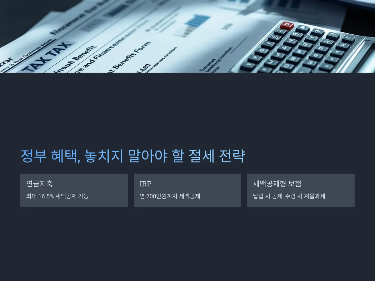노후 준비를 하며 절세 전략을 함께 세운다면 자산 누수를 줄이고 효율적인 자산 운영이 가능합니다. 대표적인 수단으로는 연금저축, IRP(개인형 퇴직연금), 세액공제형 보험 등이 있습니다. 이들 상품은 납입 시점에서 최대 16.5%까지 세액 공제를 받을 수 있고, 수령 시점에는 일정한 조건 하에 저율 과세 또는 비과세가 가능합니다.