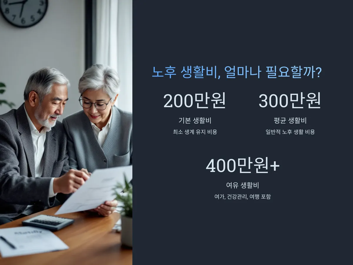 은퇴 후 생활비는 개인의 생활 방식과 건강 상태에 따라 크게 달라집니다. 보통 월 200만 원에서 300만 원을 기준으로 하지만, 이는 기본적인 생계만을 고려한 수치입니다. 여가 생활, 건강관리, 여행 등의 요소를 포함하면 월 400만 원 이상이 필요한 경우도 많습니다.