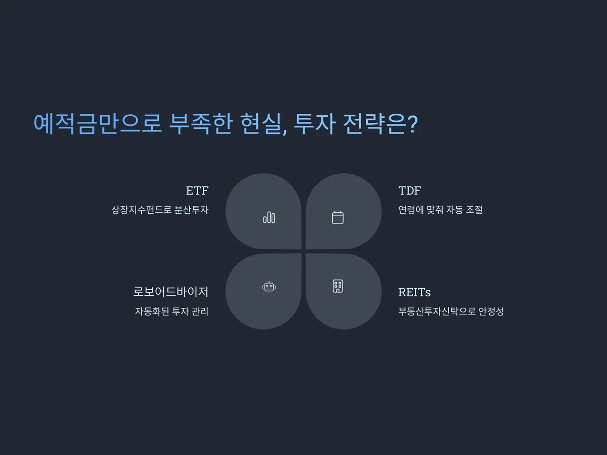 ETF(상장지수펀드), TDF(타겟데이트펀드), REITs(부동산투자신탁)와 같은 중위험 중수익 상품을 활용하면 안정성과 수익성을 동시에 추구할 수 있습니다. 특히 TDF는 연령에 맞춰 자동으로 투자 비중을 조절해주기 때문에 노후 준비에 적합한 상품으로 떠오르고 있습니다.