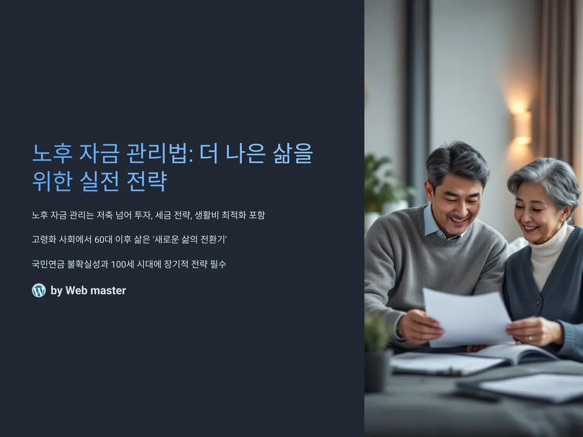 노후를 대비한 자금 관리는 단순한 저축을 넘어, 투자와 세금 전략, 생활비 최적화까지 포괄하는 중요한 과제입니다. 최근 고령화 사회가 급속히 진행되며 60대 이후의 삶에 대한 고민은 단순한 '은퇴 이후'가 아닌 '새로운 삶의 전환기'로 인식되고 있습니다. 특히 국민연금의 지급 불확실성과 100세 시대라는 흐름 속에서, 노후 자금은 단기적인 접근이 아닌 장기적이고 체계적인 전략이 필수가 되었습니다.