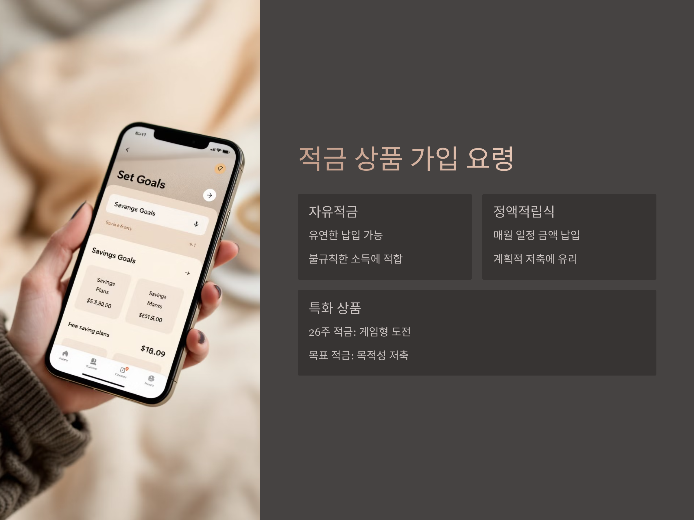 적금 상품은 '자유적금'과 '정액적립식 적금'으로 나뉘는데, 자유적금은 유연한 납입이 가능하고, 정액적립식은 일정한 금액을 매월 납입해야 하므로 자신의 소비 패턴에 맞는 상품을 고르는 것이 중요합니다.