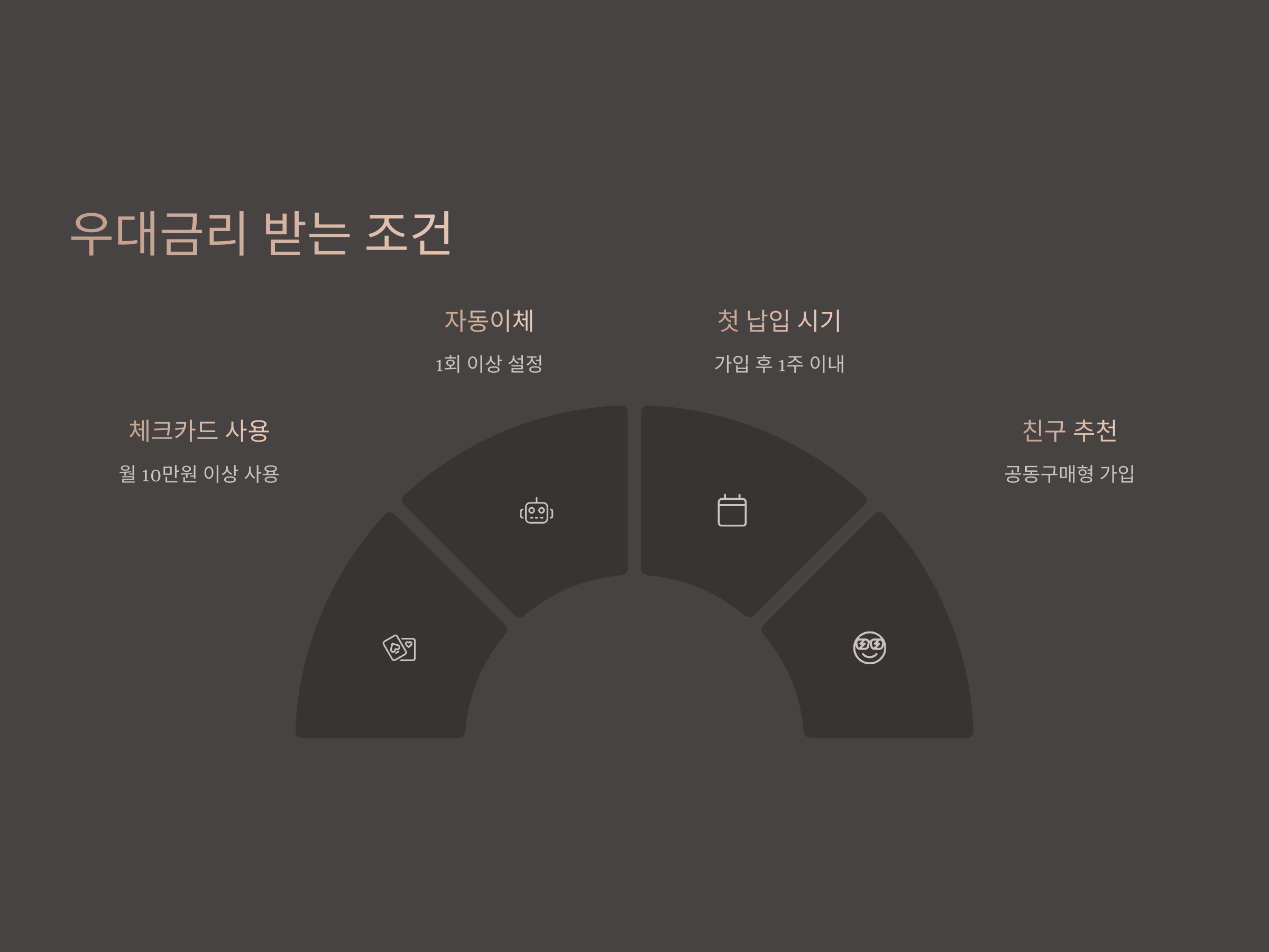 각 상품 가입 시 우대금리를 받기 위해선 간단한 조건들이 붙는데, 대표적으로는 체크카드 실적, 자동이체 등록, 일정 횟수 이상 로그인 등입니다. 이 조건을 사전에 설정해두면 자동으로 우대금리를 받을 수 있어 매우 효율적입니다.