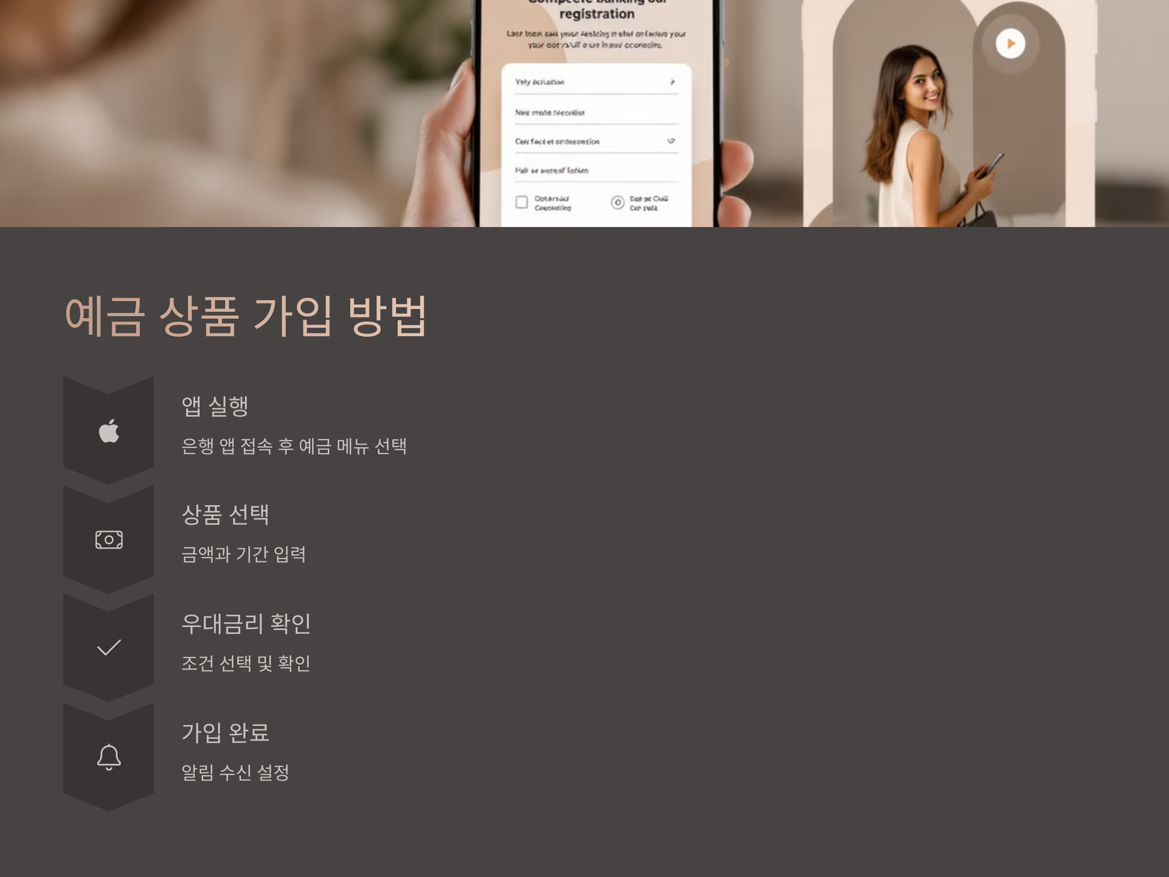 예금은 일정 금액을 일정 기간 동안 예치해두고 이자를 받는 방식으로, 고정적인 금리 혜택을 기대할 수 있습니다. 대부분의 인터넷 은행은 모바일 앱 또는 웹사이트를 통해 예금 상품을 간단히 가입할 수 있으며, 가입 과정은 거의 유사하지만 은행별 UI 차이와 조건이 약간씩 다릅니다.