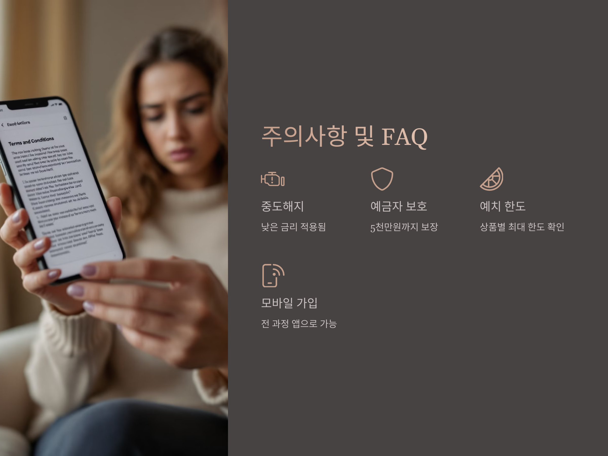 인터넷 은행 상품은 비대면으로 간편하지만, 몇 가지 주의할 점도 있습니다. 우선, 예·적금 상품은 대부분 중도 해지 시 기본금리가 아닌 중도해지금리가 적용되므로, 가능한 만기까지 유지하는 것이 중요합니다.