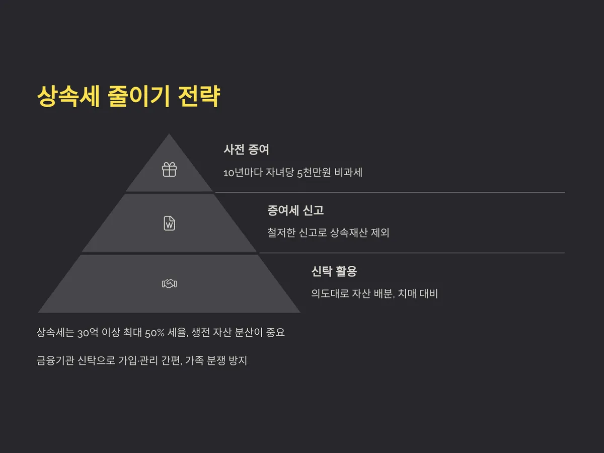 금융기관 신탁은 가입과 관리가 간편하고, 자녀들에게도 불필요한 법적 분쟁을 방지할 수 있어 상속세뿐 아니라 가정의 평화까지 지킬 수 있는 중요한 도구입니다.