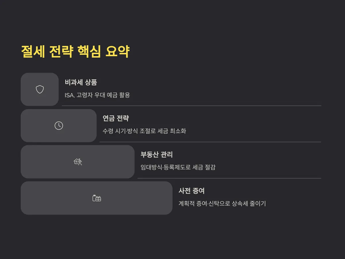 마지막으로 절세 전략은 일회성으로 끝나는 것이 아니라, 지속적인 관리가 필요합니다. 특히 고령층은 건강, 자산, 가족관계의 변화가 잦아 세무 전략도 그에 맞춰 유연하게 수정되어야 합니다. 세무사 또는 공인회계사와의 정기적인 상담을 통해 본인의 상황을 정확히 반영한 맞춤형 전략을 수립하는 것이 중요합니다.