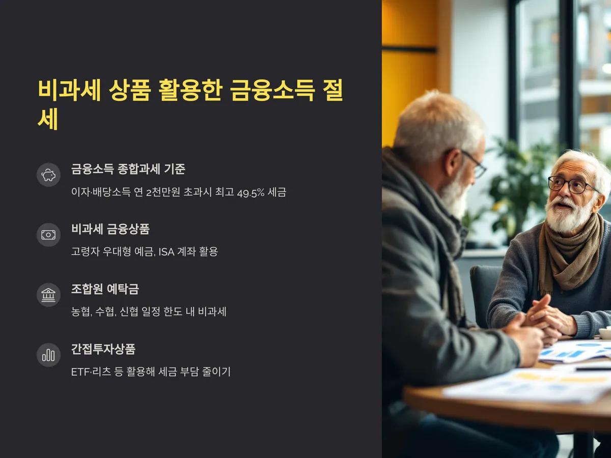 고령층에게 금융소득 종합과세 기준은 큰 부담입니다. 특히 이자 및 배당소득이 연 2천만 원을 초과할 경우, 기타 소득과 합산하여 최고 49.5%까지 세금을 부담해야 할 수 있습니다. 이를 피하기 위해 가장 먼저 고려할 수 있는 것이 바로 '비과세 금융상품'입니다.