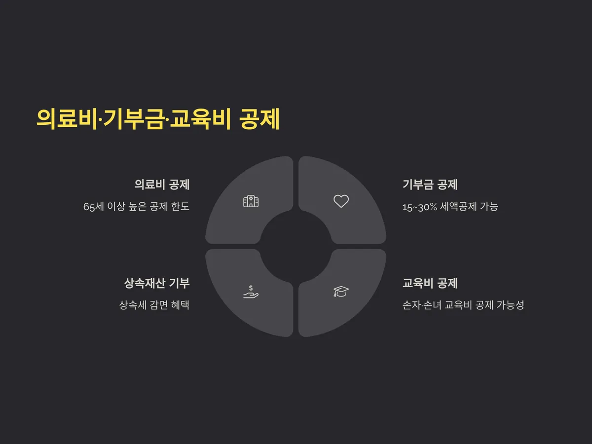 교육비 공제는 본인이 아닌 손자·손녀의 교육비를 부담한 경우에도 공제가 가능한지에 대한 질의가 많지만, 이는 기본공제 대상 여부에 따라 달라지므로 세무전문가와의 상담이 필요합니다. 실질적으로는 고령층의 자산 이전과 공제를 동시에 고려할 수 있는 항목입니다.