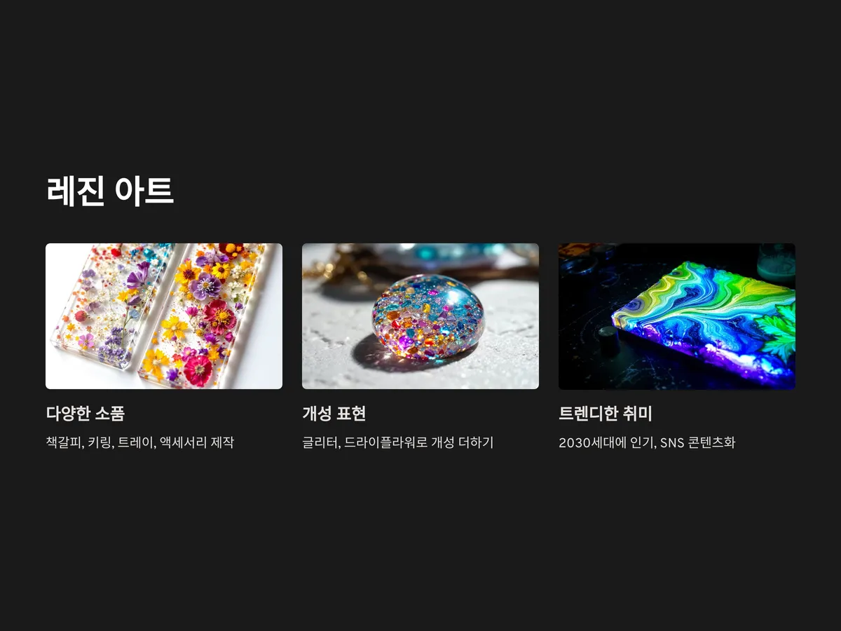 레진 아트는 투명한 레진 액체를 굳혀서 다양한 소품을 만드는 공예입니다. 책갈피, 키링, 트레이, 액세서리 등 다양한 형태로 만들 수 있고, 글리터, 드라이플라워, 작은 조각 등으로 개성을 더할 수 있어 요즘 2030세대 사이에서 큰 인기를 얻고 있습니다.