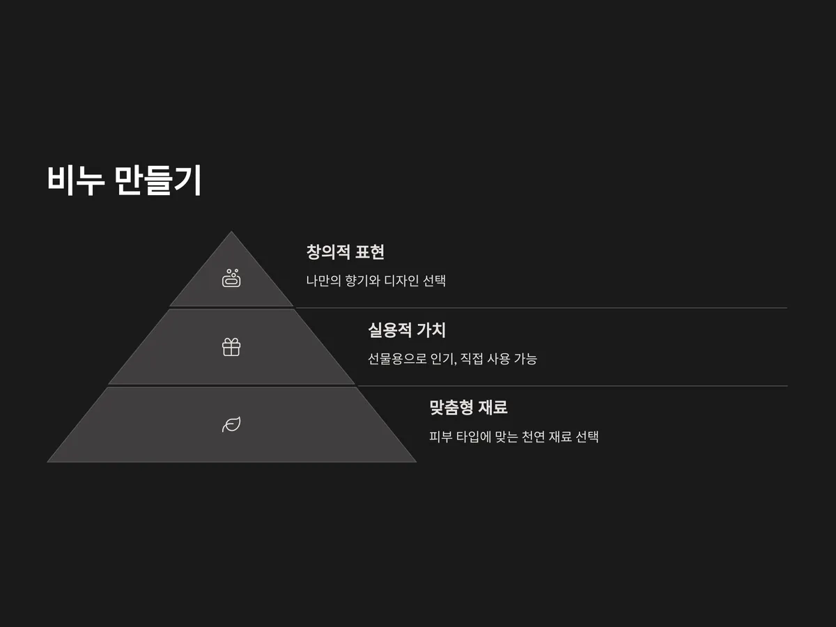 또한 피부 타입에 맞는 천연 재료를 선택해 만들 수 있어 뷰티와 건강에 관심 있는 분들에게도 매력적입니다. 무엇보다 완성된 비누는 선물용으로도 인기 있어 실용성과 감동을 동시에 줄 수 있죠. 정서적 만족과 더불어 주변 사람들과의 교류에도 도움이 되는 취미입니다.