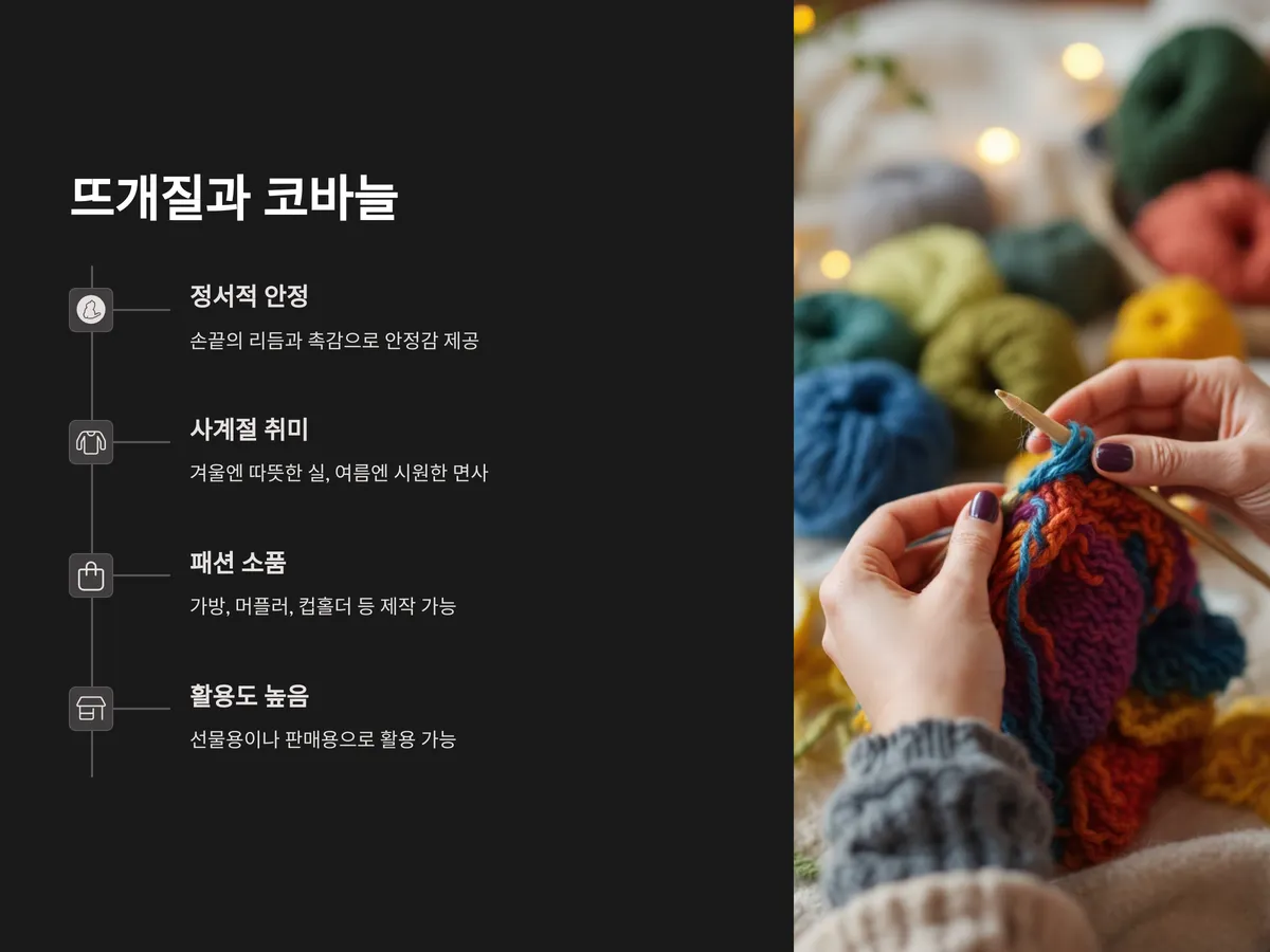 뜨개질은 처음엔 어렵게 느껴질 수 있으나, 기본적인 코만 익히면 다양한 패턴으로 응용이 가능해 도전 욕구를 자극합니다. 완성된 작품은 선물용이나 판매용으로도 활용할 수 있어 활용도가 높은 취미입니다.