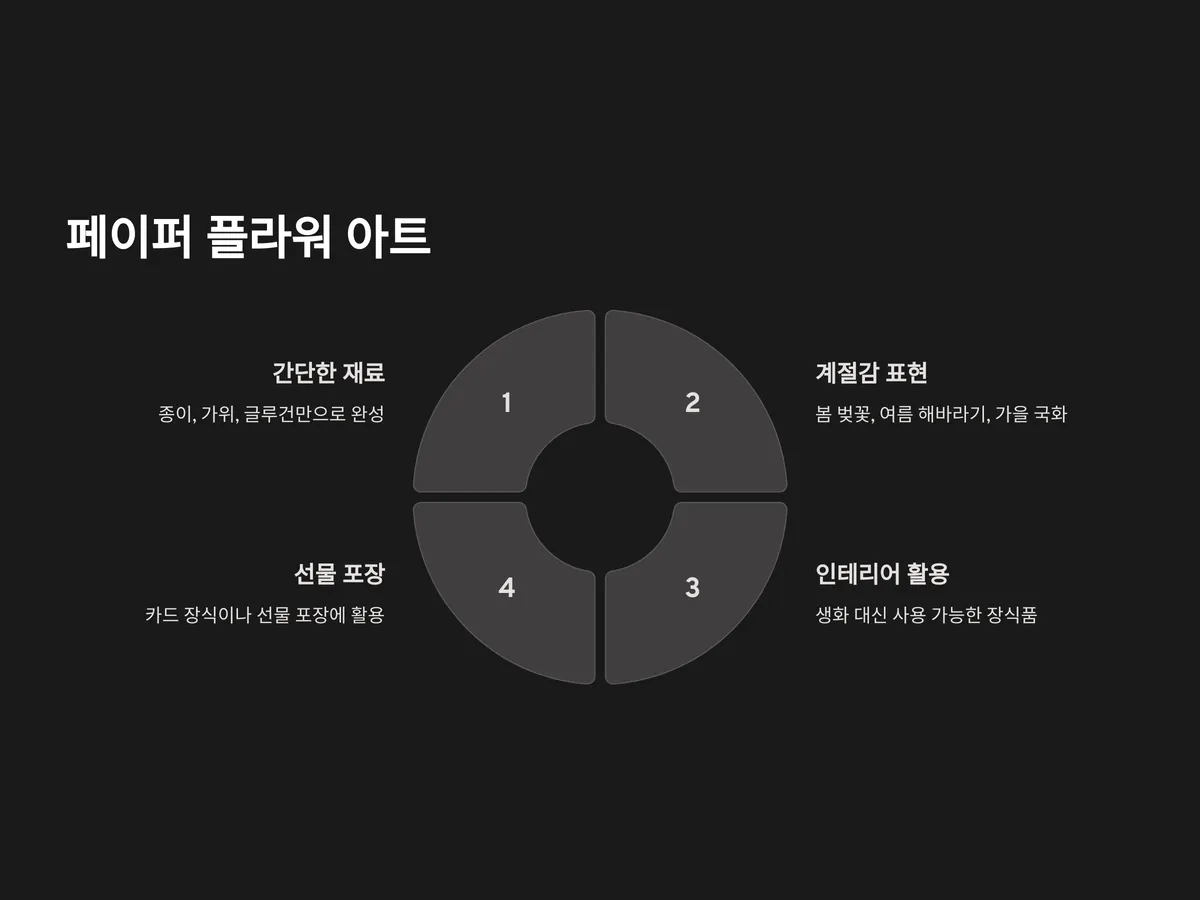 페이퍼 플라워는 계절에 따라 다양한 테마로 꾸밀 수 있어, 봄에는 벚꽃, 여름에는 해바라기, 가을에는 국화처럼 계절감을 표현하기에도 좋습니다. 또한 선물 포장이나 카드 장식에 활용할 수 있어 실용성도 뛰어납니다.