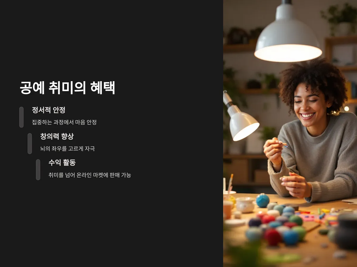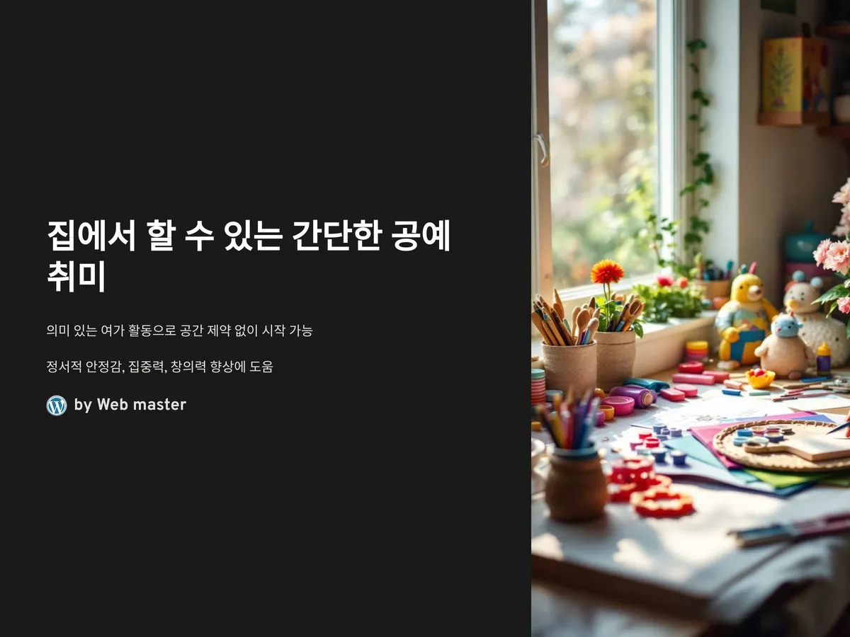 실제로 집에서 할 수 있는 간단한 공예 취미는 정서적인 안정감은 물론, 뇌의 좌우를 고르게 자극해 집중력과 창의력 향상에도 도움을 줍니다. 이 글에서는 공간과 도구가 많이 필요하지 않으면서도 흥미롭고 만족감 높은 대표적인 공예 취미 6가지를 소개합니다.