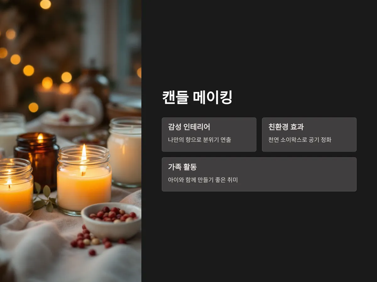 키트 구매만으로도 간편하게 시작할 수 있고, 아이와 함께 만들기에도 좋은 활동입니다. 또한 완성된 캔들은 선물로도 활용도가 높아 다양한 상황에 활용할 수 있습니다. 점점 더 많은 사람들이 감성적인 공간 연출을 위해 찾는 취미입니다.