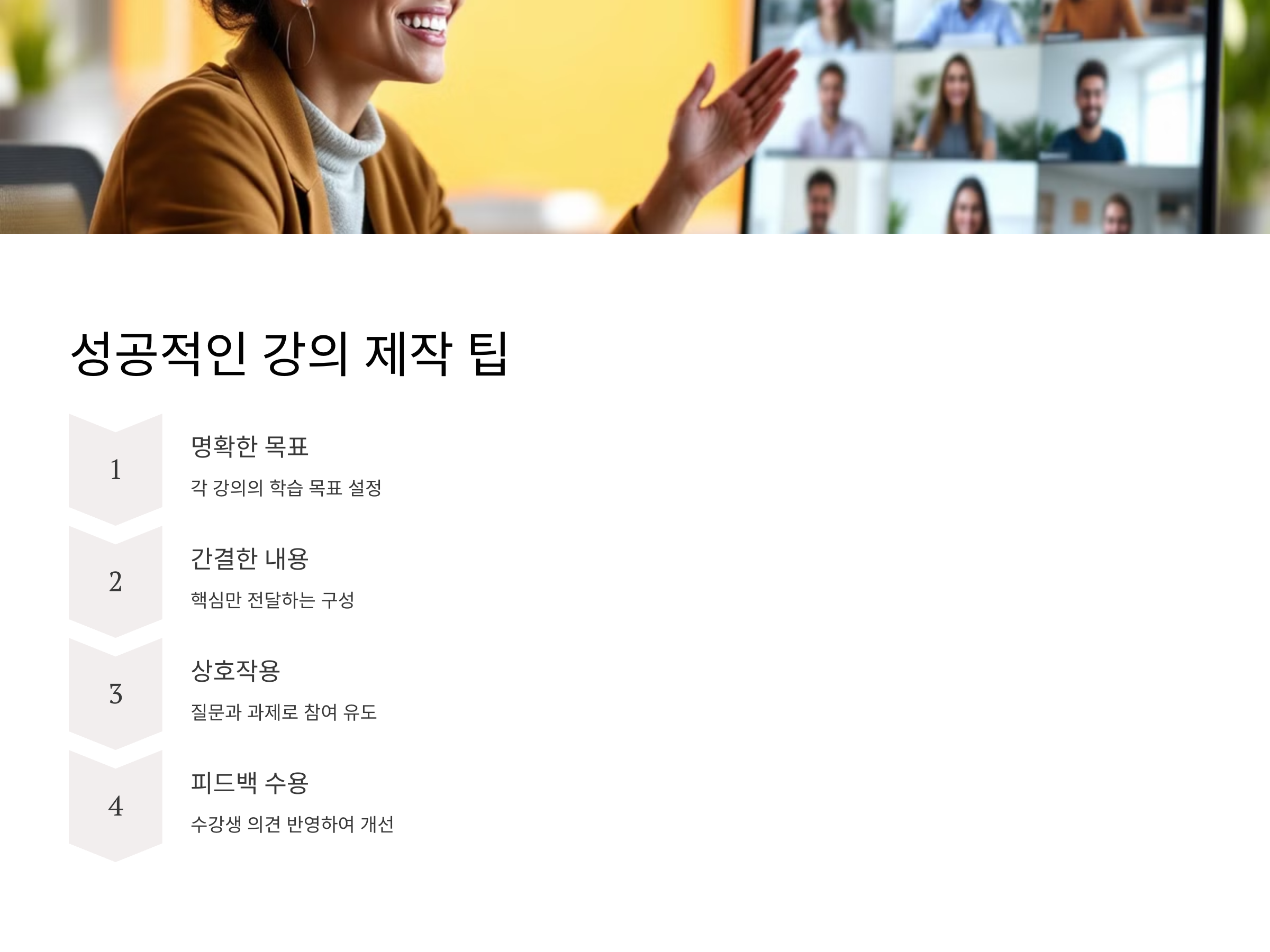 그 다음으로는 강의 목차 및 내용을 구성해야 합니다. 강의가 체계적이고 일관성 있게 진행될 수 있도록, 각 레슨별로 어떤 내용을 다룰지 미리 계획하세요. 강의 내용은 짧고 간결하게 전달할 수 있도록 구성하는 것이 중요합니다. 각 강의의 핵심 내용을 뽑아낼 수 있는 구조로 설계하세요.