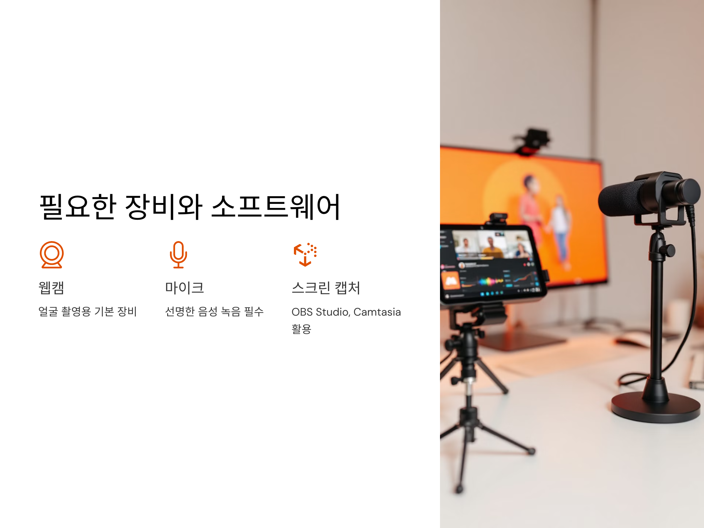 집에서 온라인 강의를 제작하기 위해 필요한 기본 장비와 소프트웨어가 있습니다. 먼저, 강의 내용을 촬영하거나 녹음할 장비가 필요합니다. 가장 기본적인 장비는 웹캠과 마이크입니다. 웹캠을 통해 얼굴을 촬영하고, 마이크를 통해 강의 음성을 선명하게 담을 수 있습니다. 고급 장비 없이도 충분히 괜찮은 퀄리티의 강의를 제작할 수 있습니다.