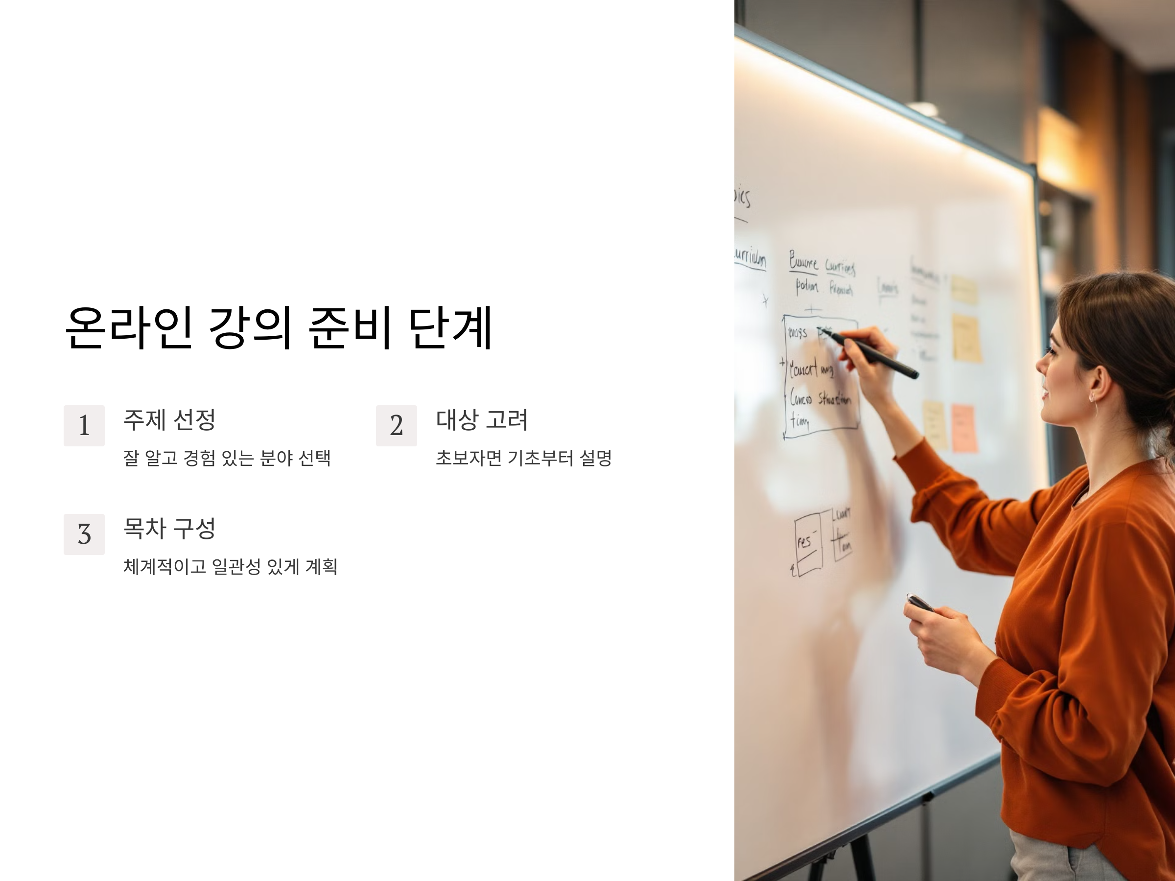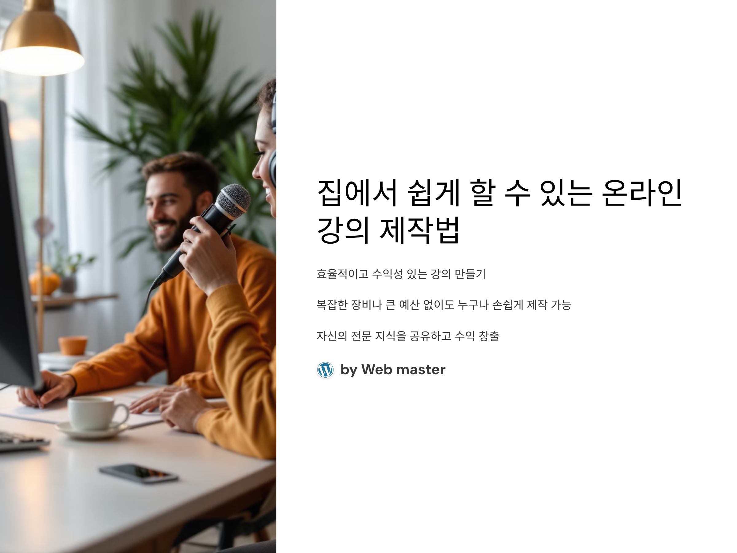 온라인 강의는 요즘 많은 사람들이 집에서 자신의 전문 지식을 공유하고, 이를 통해 수익을 창출하는 방법 중 하나로 큰 인기를 끌고 있습니다. 이제는 복잡한 장비나 큰 예산 없이도 누구나 손쉽게 온라인 강의를 만들 수 있는 시대가 되었습니다. 그렇다면 집에서 어떻게 온라인 강의를 만들 수 있을까요? 이 글에서는 집에서 쉽게 온라인 강의를 제작하는 방법을 단계별로 알려드리겠습니다. 초보자도 쉽게 따라 할 수 있도록 구체적으로 설명드릴 테니, 강의를 시작해보세요!