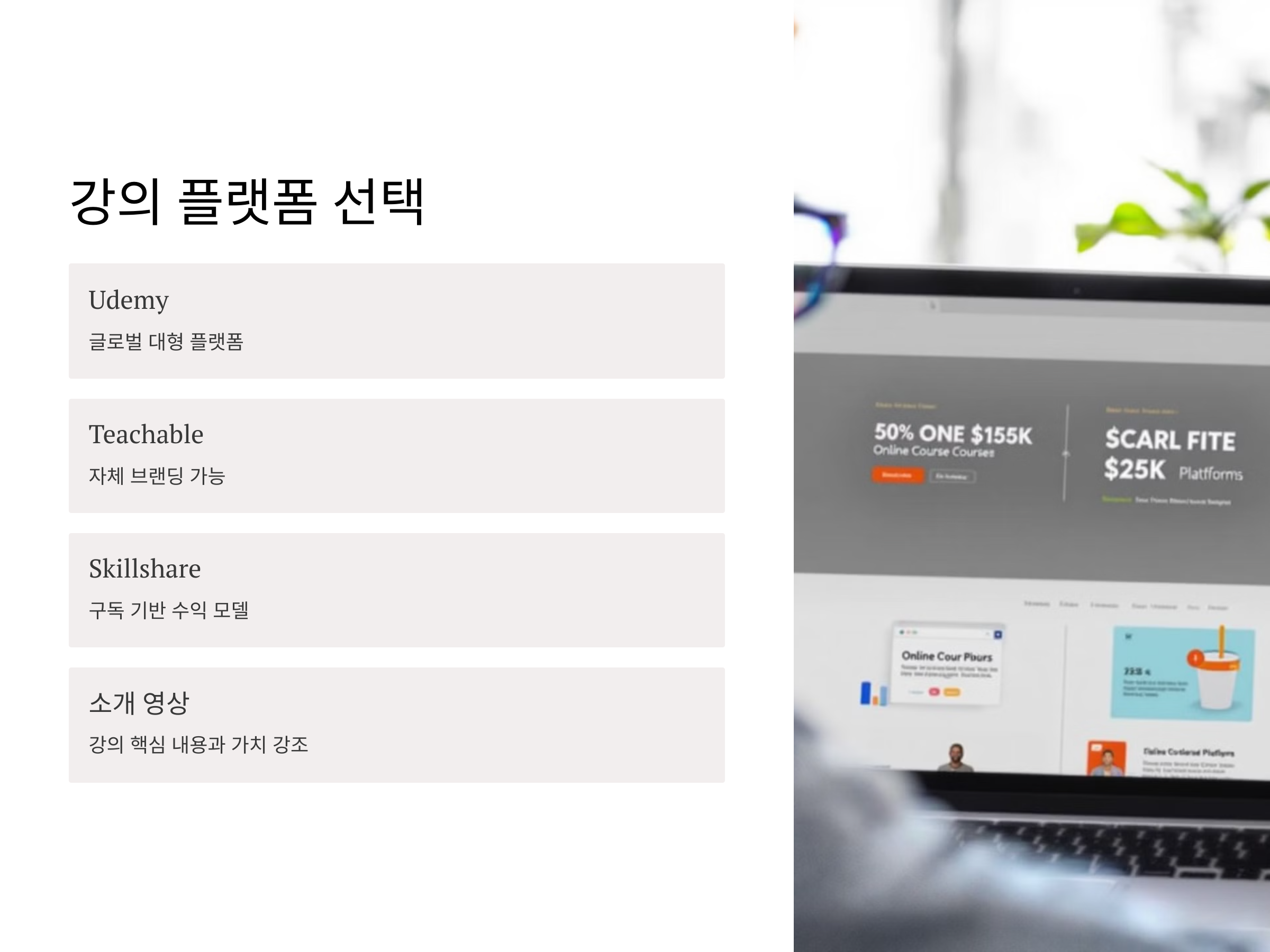 강의를 다 만들었으면, 이제 이를 판매할 플랫폼을 선택해야 합니다. 온라인 강의는 다양한 플랫폼에서 제공할 수 있는데, 대표적인 플랫폼으로는 Udemy, Teachable, Skillshare 등이 있습니다. 각 플랫폼은 강의를 업로드하고 판매할 수 있는 시스템을 제공하며, 일부 플랫폼은 수익을 분배하는 방식으로 운영됩니다.