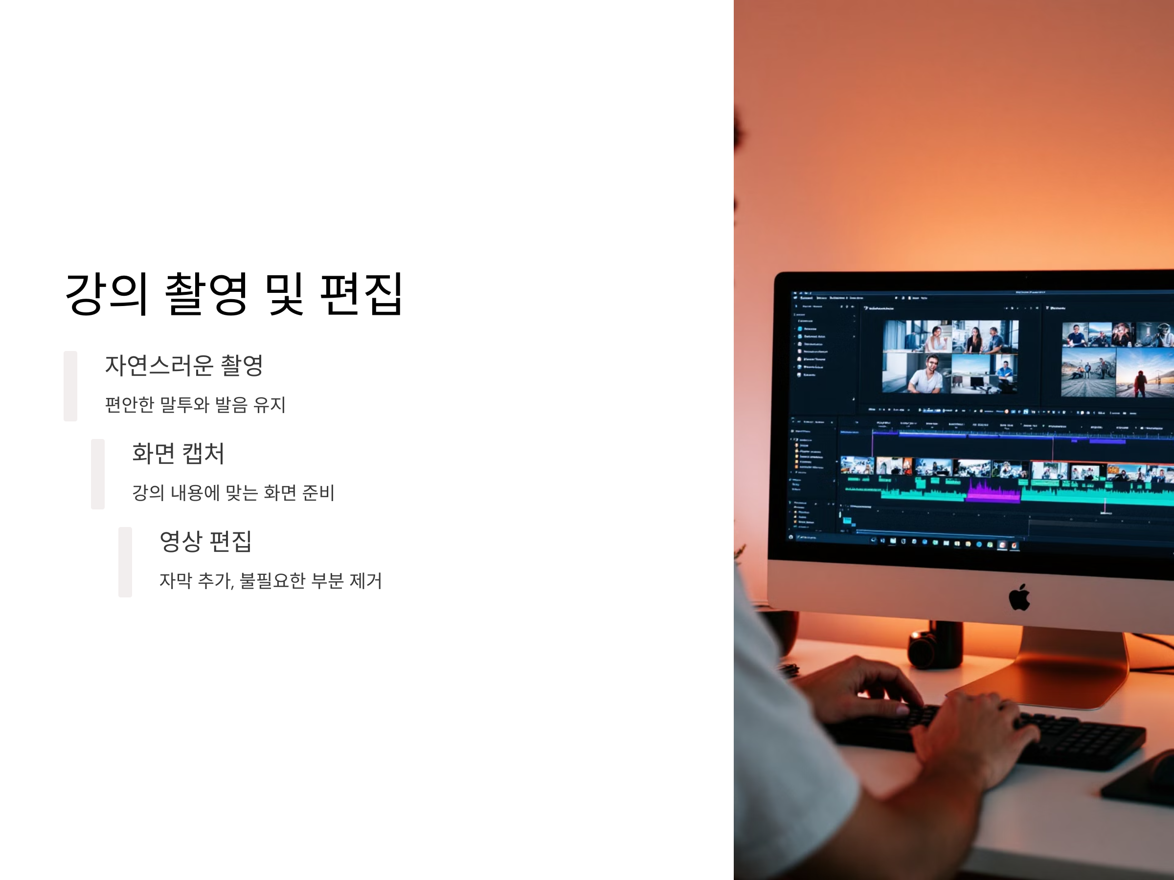 이제 강의를 촬영하는 단계입니다. 촬영 시에는 자연스러운 말투와 발음을 유지하는 것이 중요합니다. 처음에는 실수할 수도 있지만, 너무 걱정하지 마세요. 간단한 실수는 편집으로 충분히 수정할 수 있습니다. 강의 내용에 맞춰 필요한 화면을 캡처하거나 영상 촬영을 진행합니다.