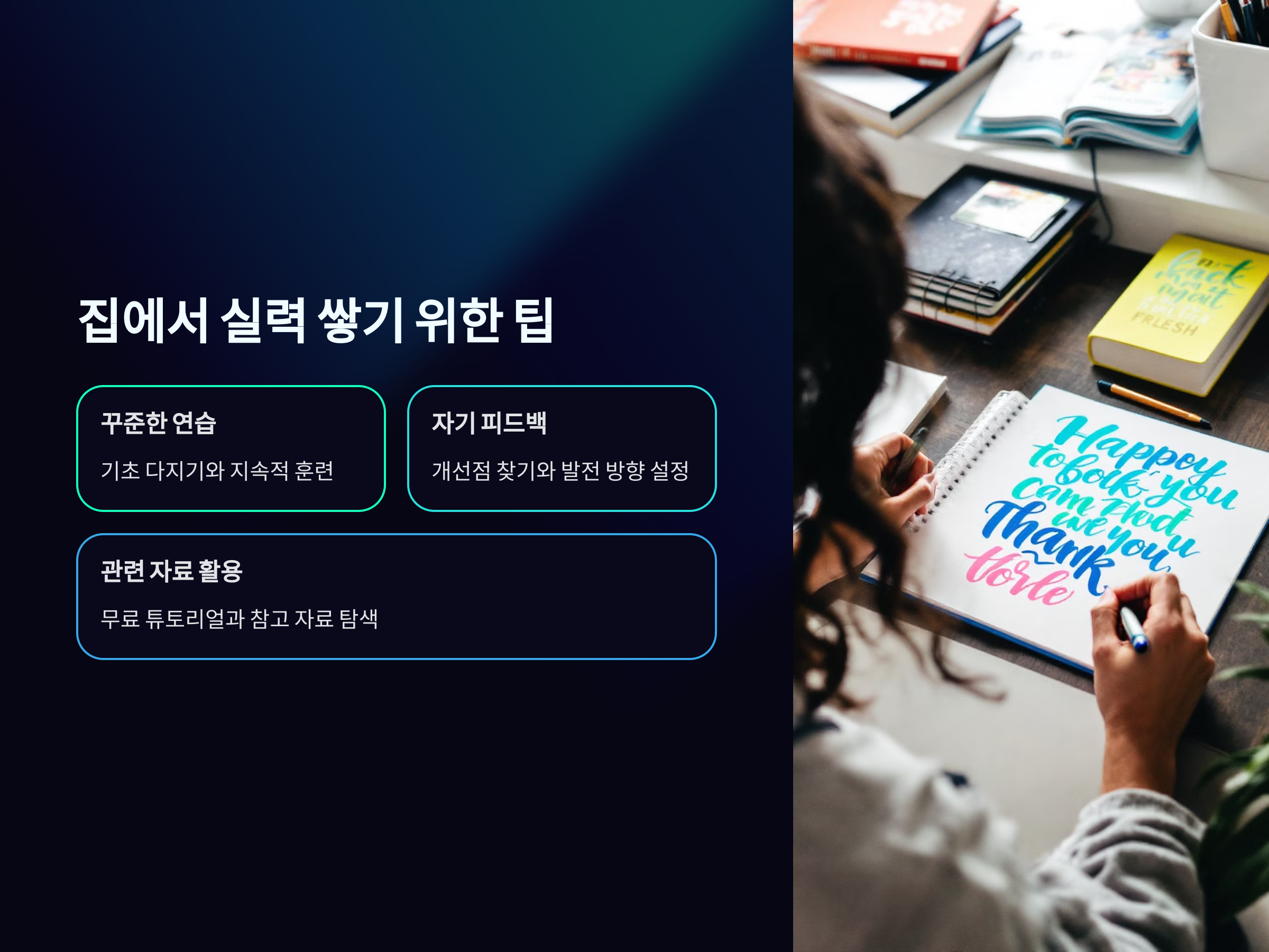 집에서 서예와 미술을 배우는 데 있어 가장 중요한 점은 꾸준한 연습입니다. 온라인 강좌를 통해 기초를 다지고, 그 후 꾸준히 연습을 해 나가는 것이 중요합니다. 또한, 자기 피드백을 통해 자신이 어떤 점을 개선해야 할지 고민해보는 과정도 큰 도움이 됩니다.