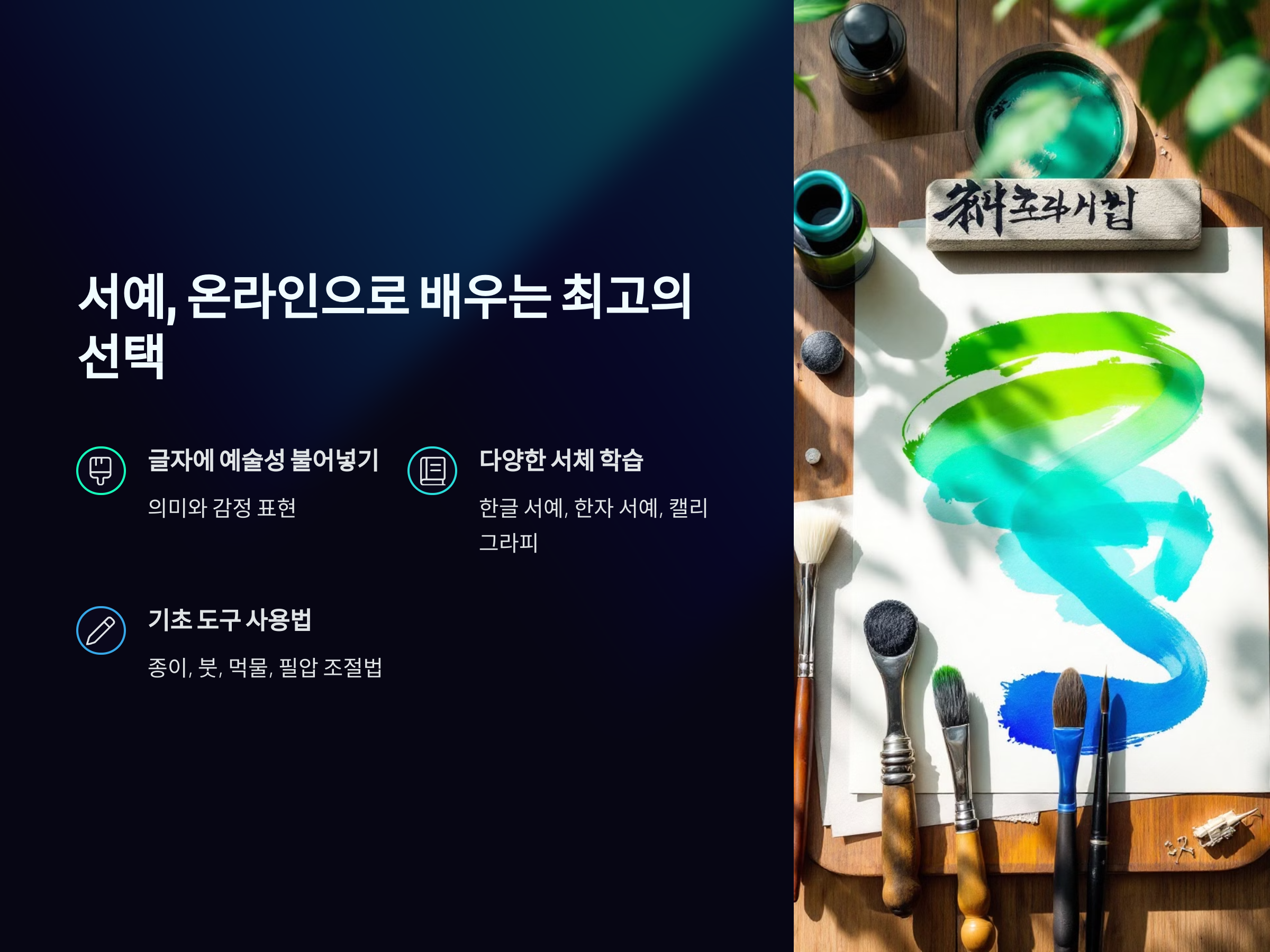 서예 강좌는 종이, 붓, 먹물, 그리고 필압 조절법과 같은 기초적인 도구 사용법도 상세히 다루어, 초보자부터 전문가까지 모두 쉽게 접근할 수 있습니다. 몇 가지 추천할 만한 온라인 서예 강좌 플랫폼은 다음과 같습니다.
