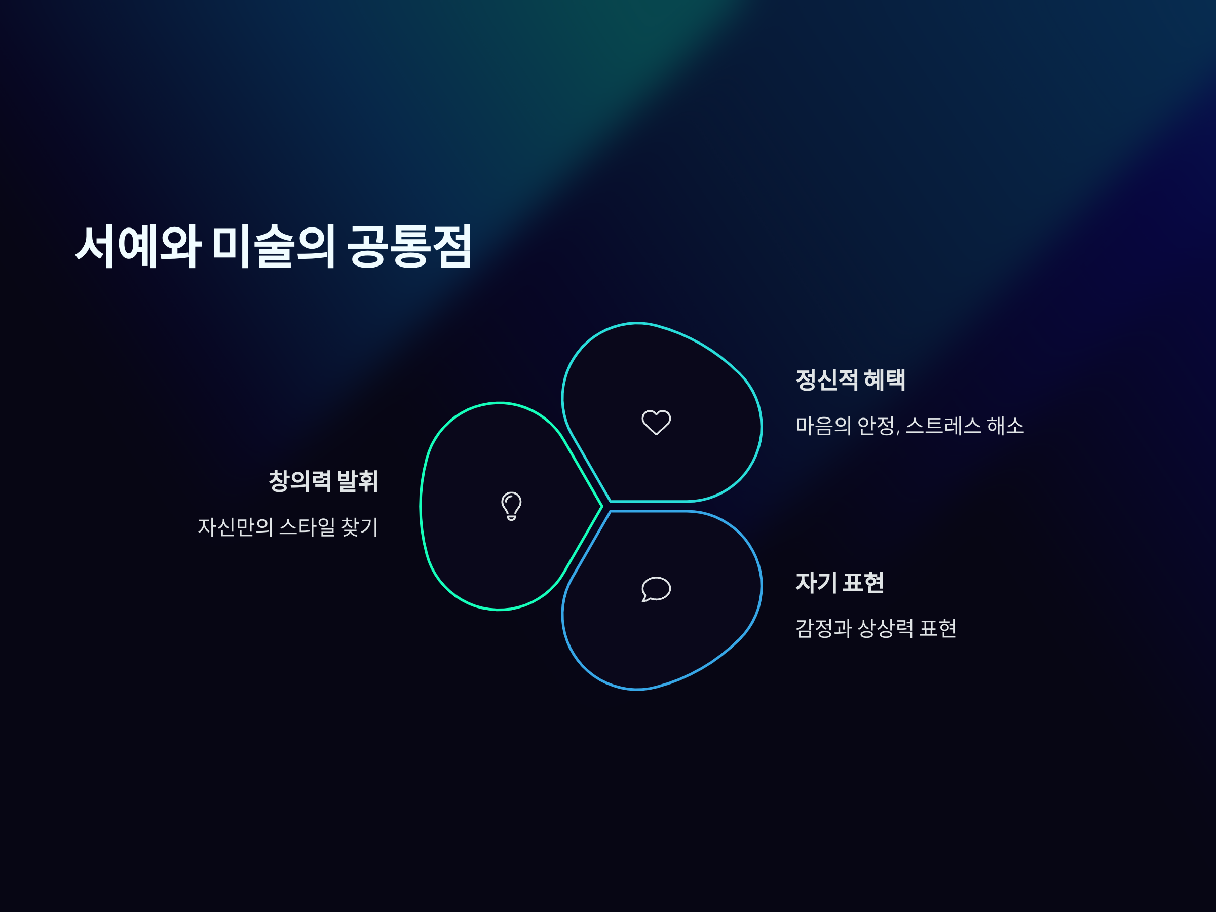 이 두 가지 예술 활동을 통해 얻는 정신적 혜택도 큽니다. 예술은 마음의 안정을 주며, 스트레스 해소에도 큰 도움이 됩니다. 또한, 서예와 미술 모두 자기 표현을 통해 자신을 더 잘 이해하고, 창작의 즐거움을 느낄 수 있습니다.