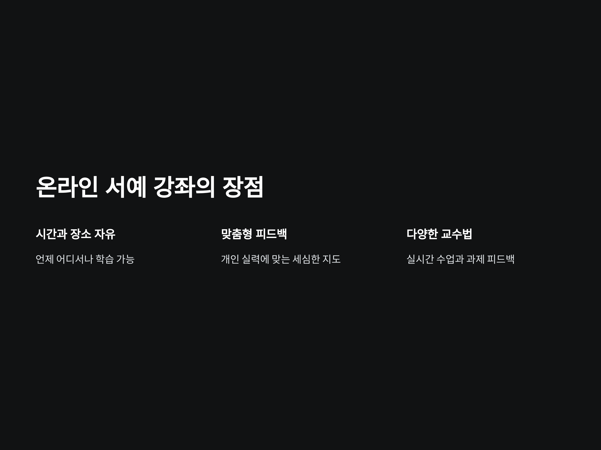 서예는 한번 배우면 꾸준히 실력을 키워 나갈 수 있는 예술이기 때문에, 지속적으로 학습할 수 있는 환경을 제공하는 온라인 강좌는 매우 유익합니다. 언제든지 수업을 듣고, 자유롭게 연습할 수 있어 서예를 취미로 삼기에도 적합합니다.