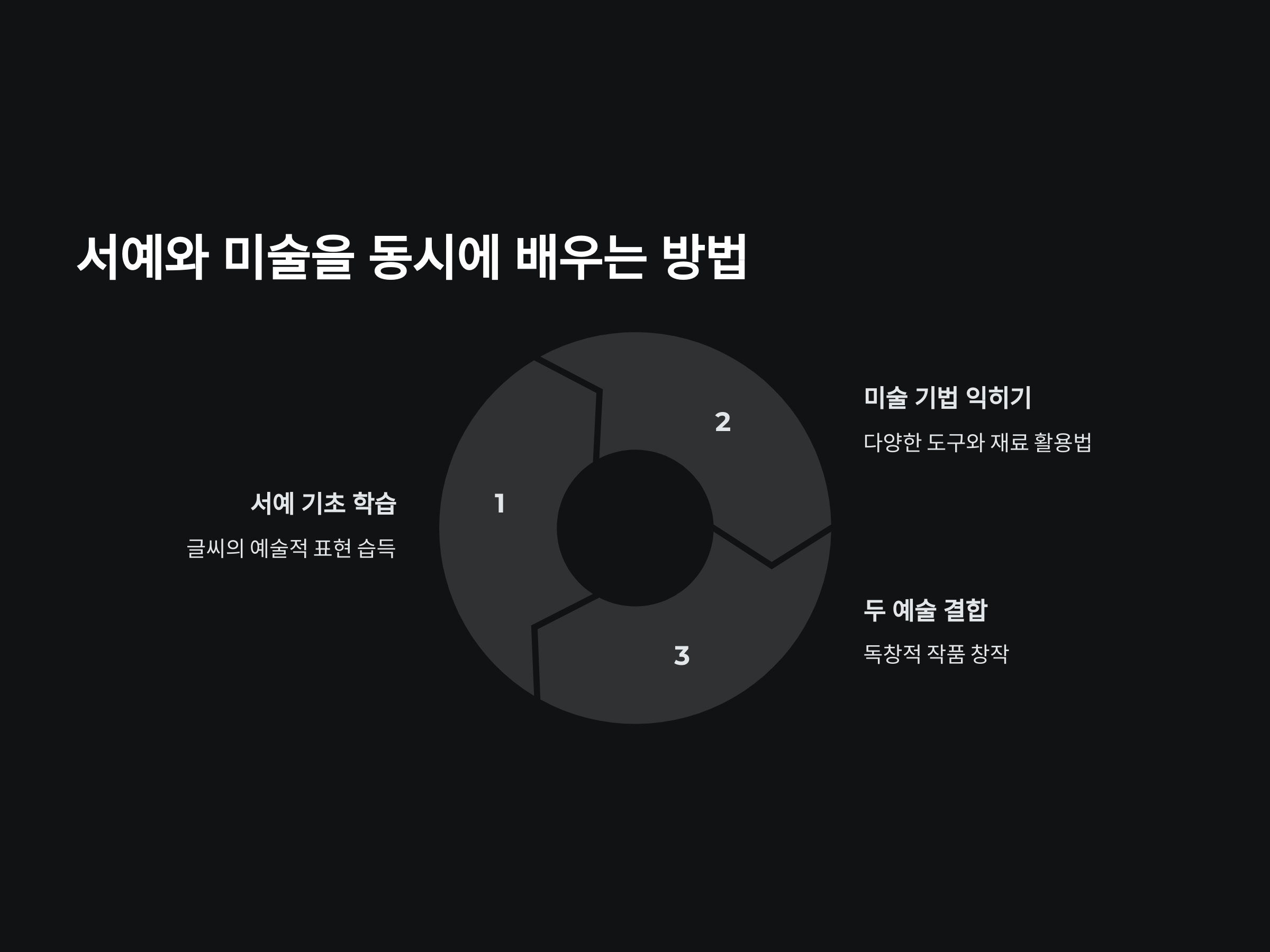 두 가지 분야를 동시에 배우면 서로 다른 영역에서 창의성을 발휘할 수 있습니다. 예를 들어, 서예에서 배운 아름다운 글씨를 미술 작품에 결합하거나, 미술에서 배운 기법을 서예 작업에 적용할 수 있습니다. 서예와 미술을 함께 배우는 것은 그 자체로 큰 재미와 만족을 줄 수 있습니다.