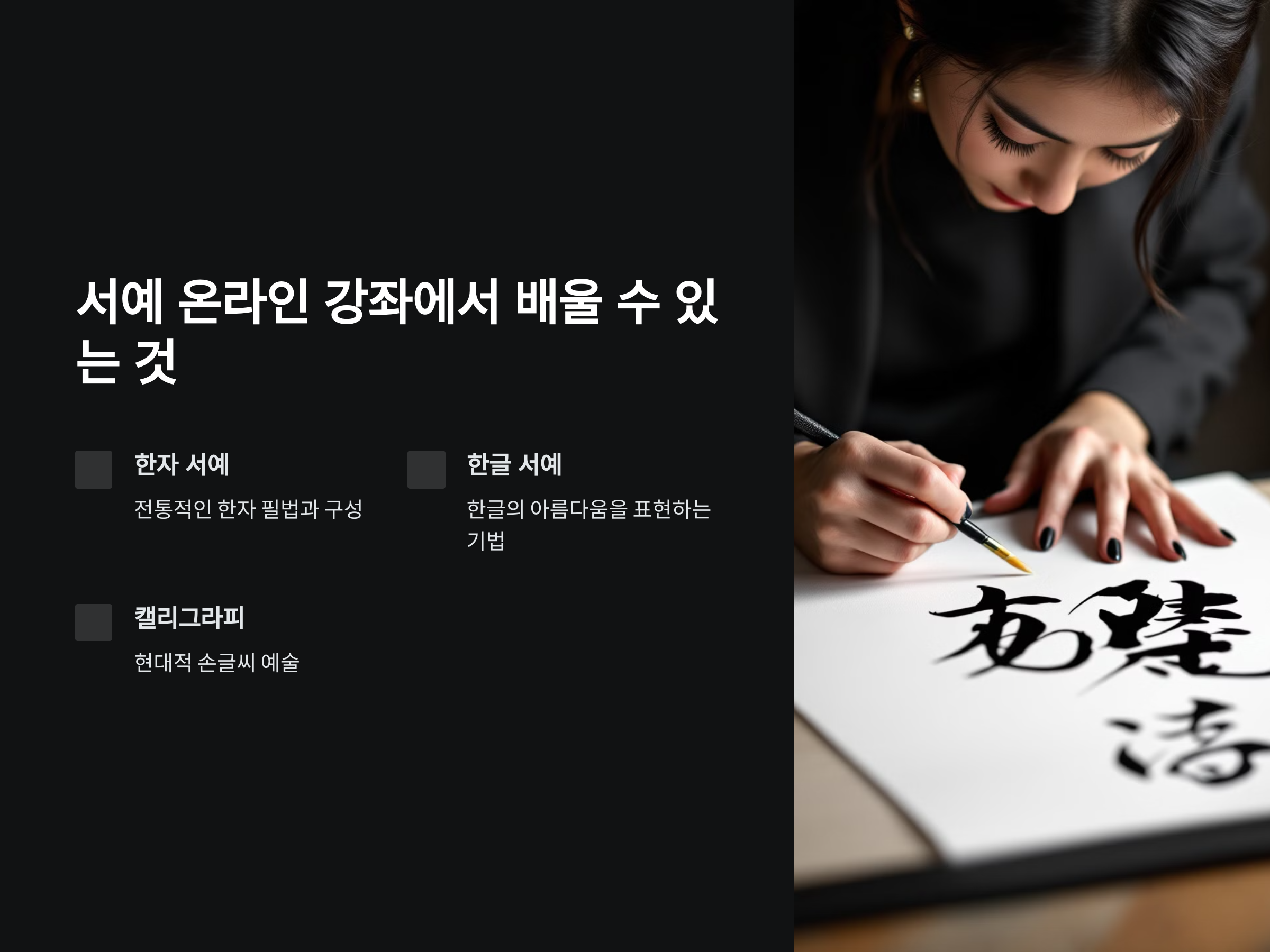 서예의 기초부터 심화까지 다룬 온라인 강좌에서는 '한자 서예', '한글 서예', '캘리그라피'와 같은 다양한 세부 전공이 있습니다. 한자 서예는 한자를 아름답게 쓰는 데 집중하며, 한글 서예는 한글의 미를 살려 글씨를 쓰는 방법을 배우게 됩니다. 캘리그라피는 서양 스타일의 손글씨 예술로, 다채로운 도구와 기법을 사용하여 아름다운 글씨를 쓰는 법을 익힐 수 있습니다.