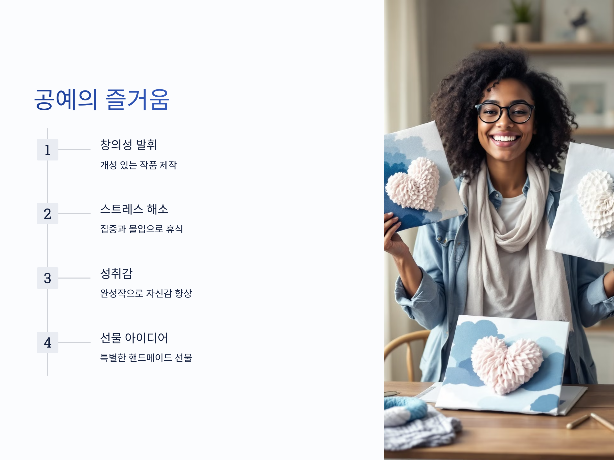 공예는 창의성을 발휘하며 여유로운 시간을 보낼 수 있는 좋은 방법입니다. 집에서 손쉽게 할 수 있는 다양한 공예 취미를 소개했으니, 여러분도 한 번 시도해 보세요. 꾸준히 하다 보면 자신만의 독특한 작품을 만들 수 있을 거예요. 즐거운 공예 시간을 보내세요!