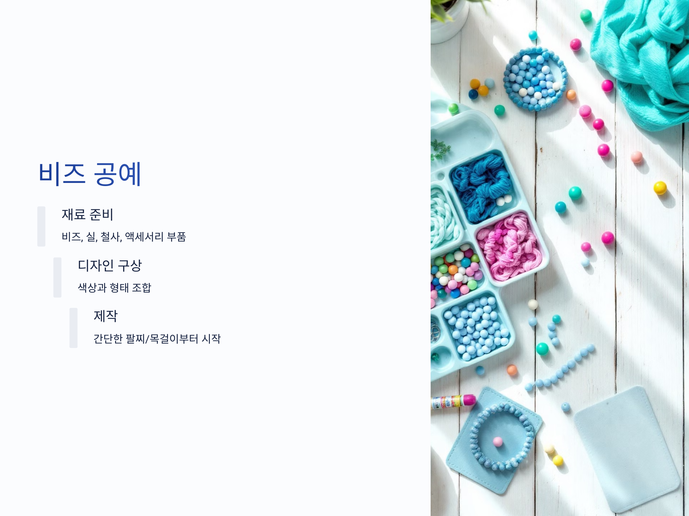 비즈를 이용한 공예는 귀걸이, 목걸이, 팔찌 등 다양한 액세서리를 만들 수 있어 인기 있는 취미입니다. 필요한 재료와 도구만 있으면 집에서도 쉽게 시작할 수 있어요. 특히, 나만의 개성 있는 액세서리를 만들 수 있어 기분 전환에도 좋습니다.