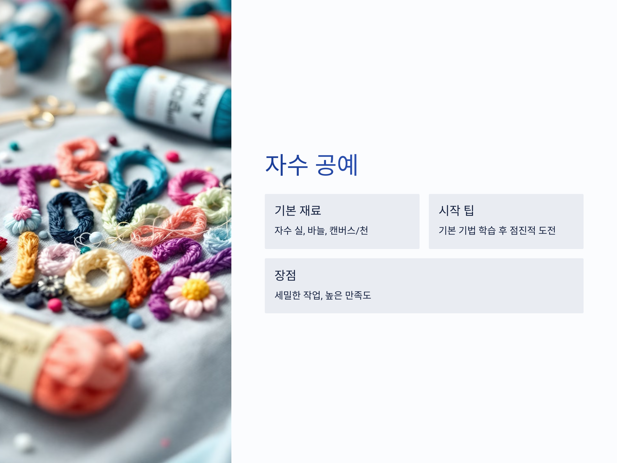 - 기본적인 자수 기법을 배우고, 차근차근 어려운 패턴으로 도전해 보세요. 소소한 취미를 넘어 아름다운 작품을 만들 수 있습니다.