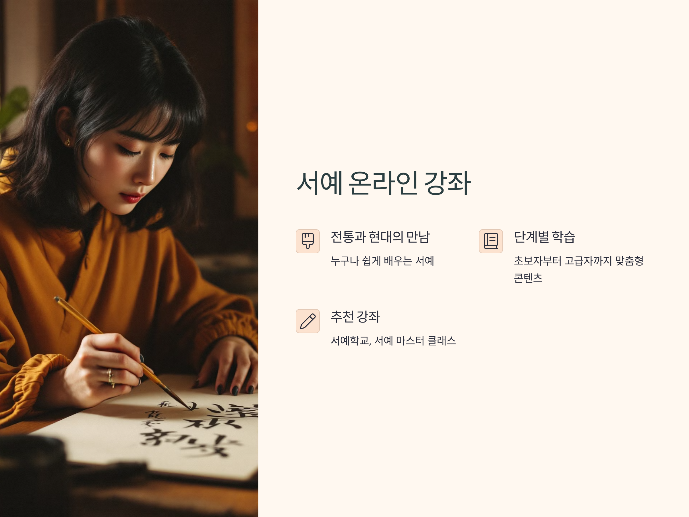 - 서예 마스터 클래스: 이 강좌는 서예의 깊이를 더할 수 있는 내용으로 구성되어 있습니다. 초급 강좌 외에도 중급 및 고급 강좌가 마련되어 있어 서예를 심도 깊게 배우고 싶은 사람에게 적합합니다.