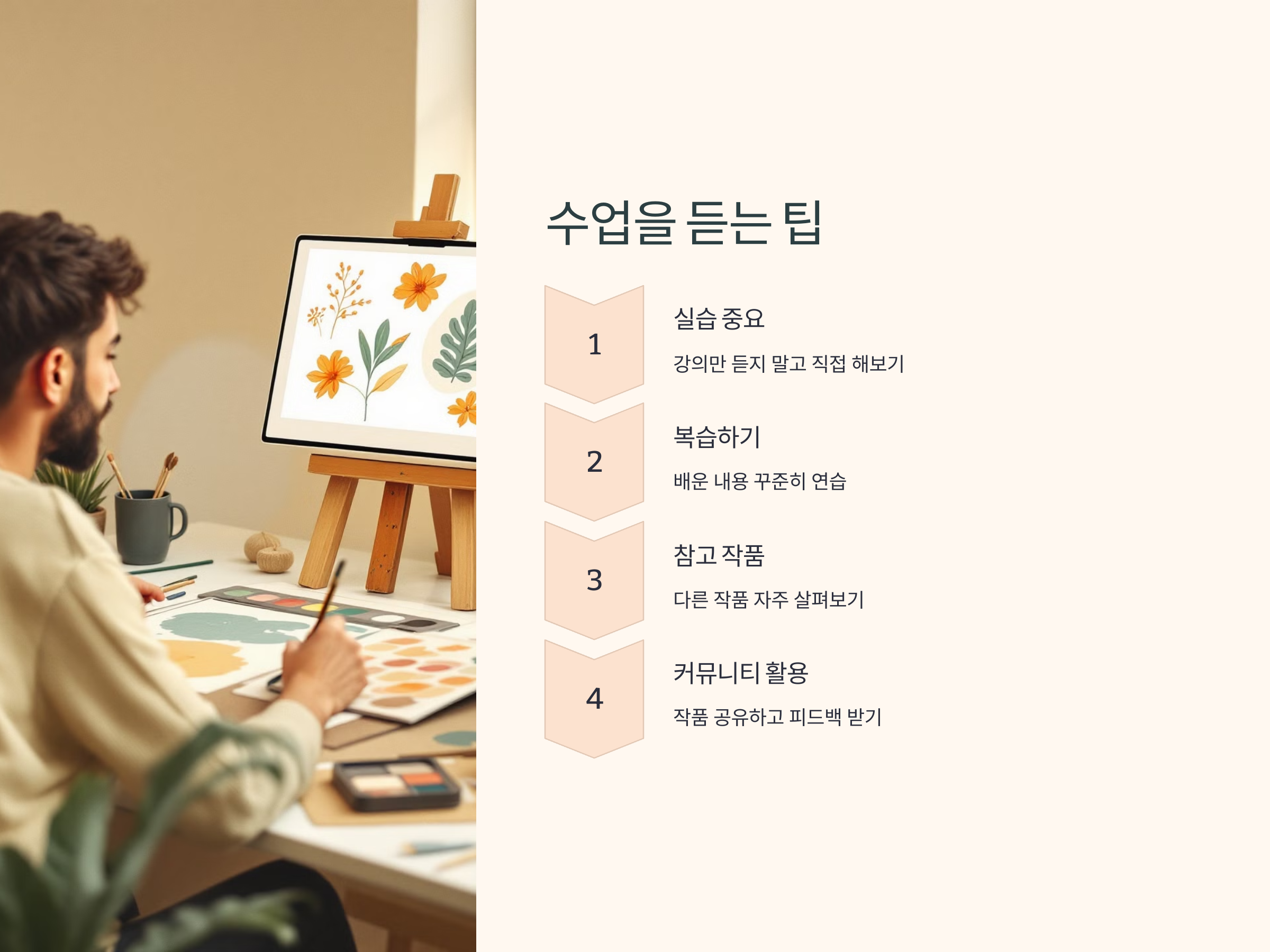 강좌를 선택하고 수업을 듣기 전에 몇 가지 팁을 염두에 두는 것이 좋습니다. 서예나 미술은 단순히 강의를 듣는 것뿐만 아니라 실제로 손으로 그려보고 연습하는 것이 매우 중요합니다. 강의에서 배운 내용을 복습하고, 다른 작품들을 자주 참고하며 실력을 쌓아가세요. 또한, 온라인 커뮤니티에 가입하여 다른 수강생들과 작품을 공유하고 피드백을 주고받는 것도 많은 도움이 됩니다.