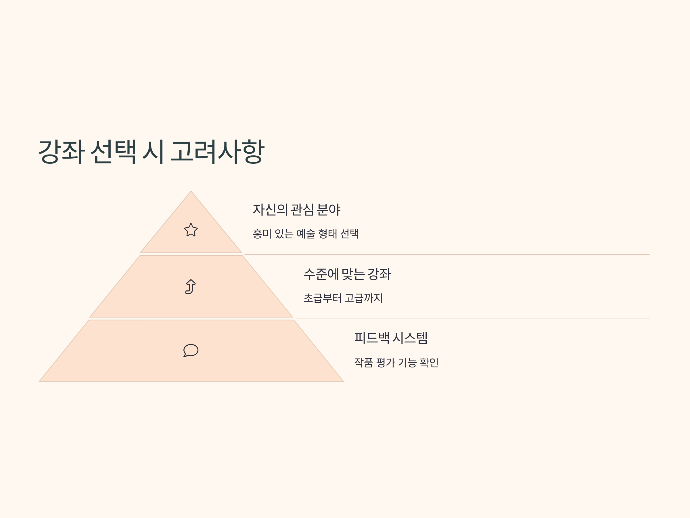 서예와 미술 강좌를 선택할 때는 몇 가지 중요한 사항을 고려해야 합니다. 자신의 수준에 맞는 강좌를 선택하는 것이 중요하며, 관심 있는 분야를 중심으로 강좌를 찾아보는 것이 좋습니다. 또한, 강의의 커리큘럼과 평가 시스템도 확인하는 것이 필요합니다. 예를 들어, 작품을 평가받거나 다른 수강생들과 피드백을 주고받을 수 있는 기능이 있다면 학습에 큰 도움이 될 것입니다.