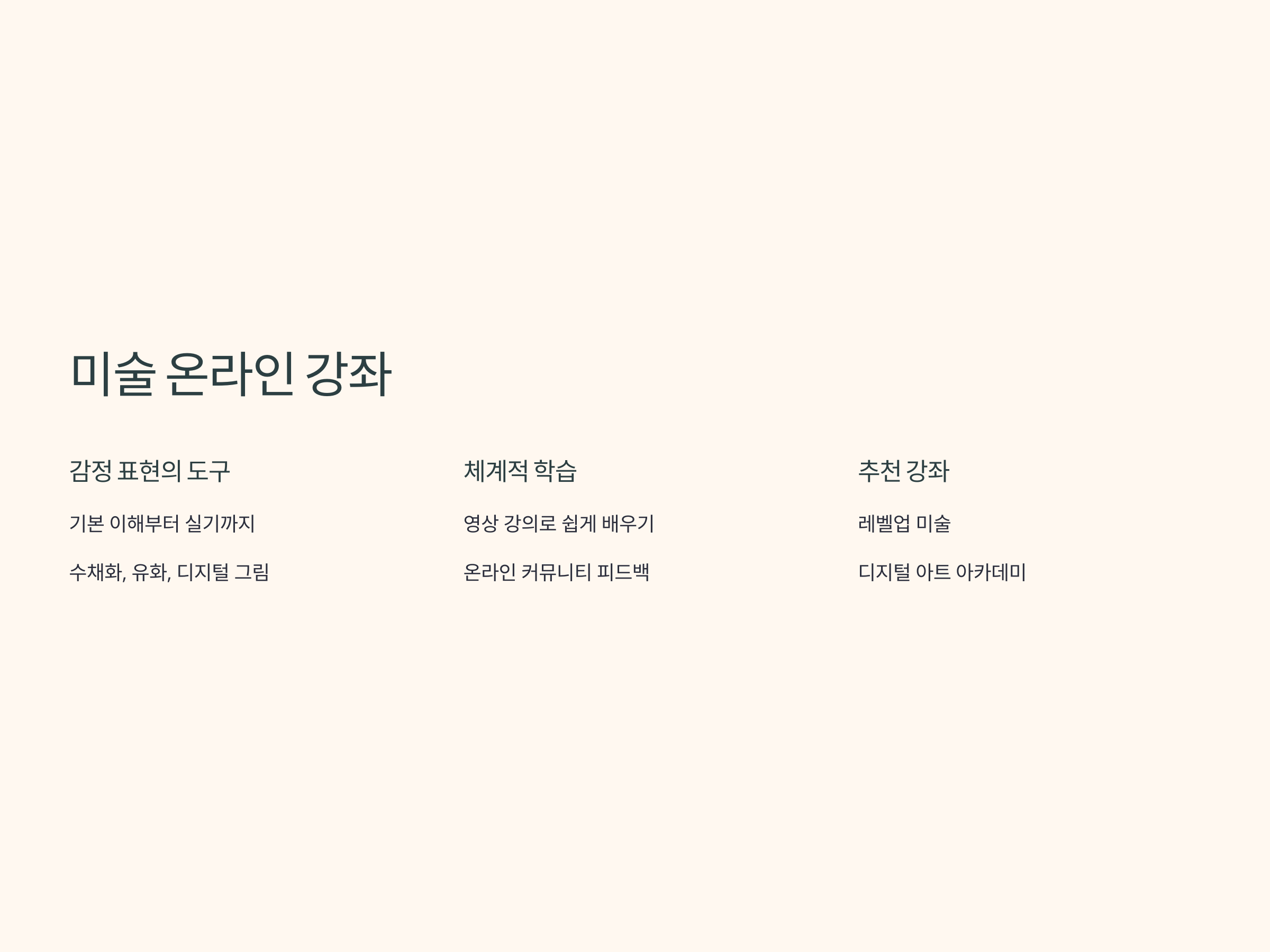 - 레벨업 미술: 이 강좌는 수채화, 유화, 아크릴화 등 다양한 기법을 다루고 있으며, 초급부터 고급까지 세분화된 과정이 제공됩니다. 미술 이론과 실기를 동시에 배울 수 있는 유익한 강좌입니다.