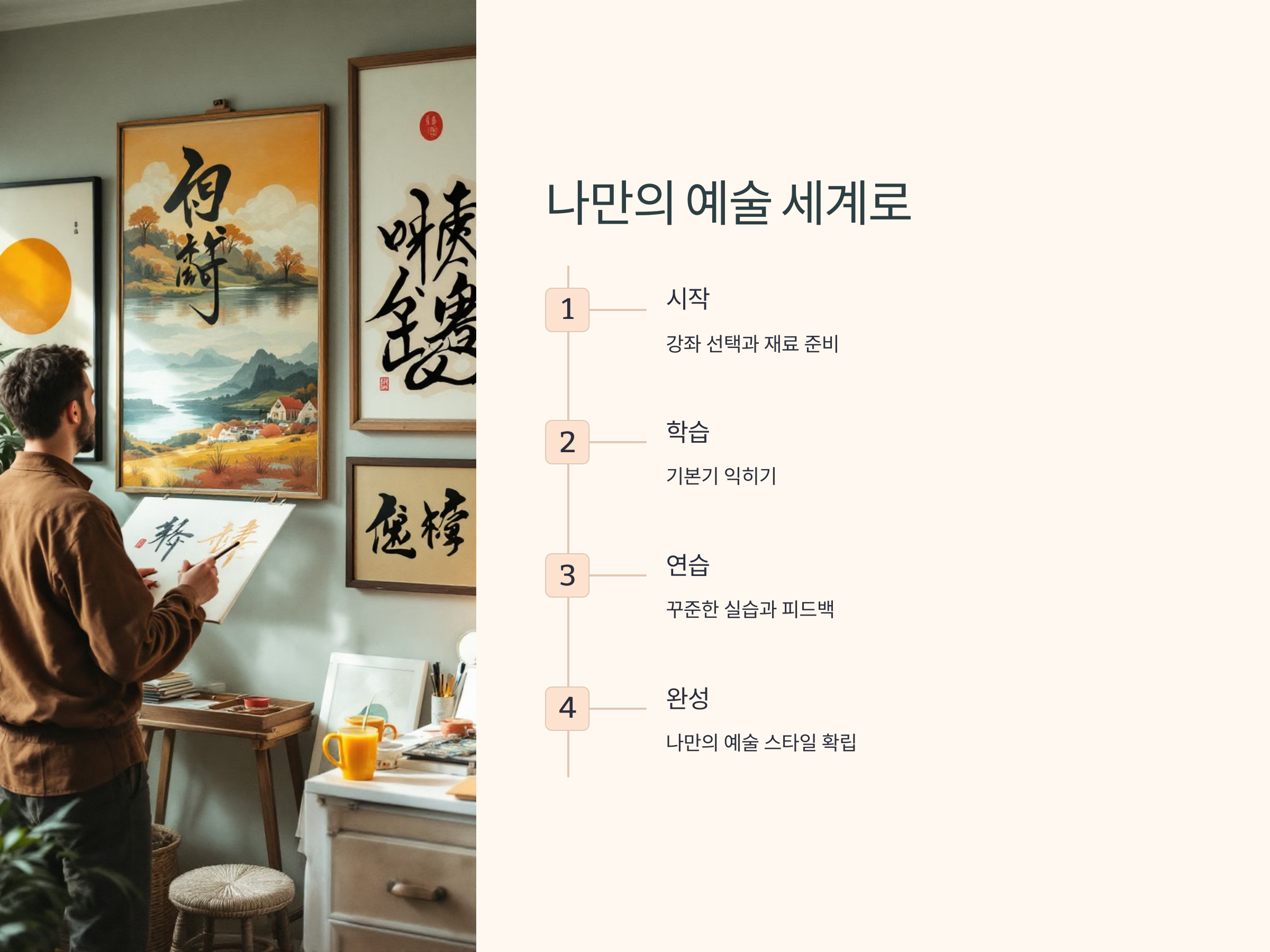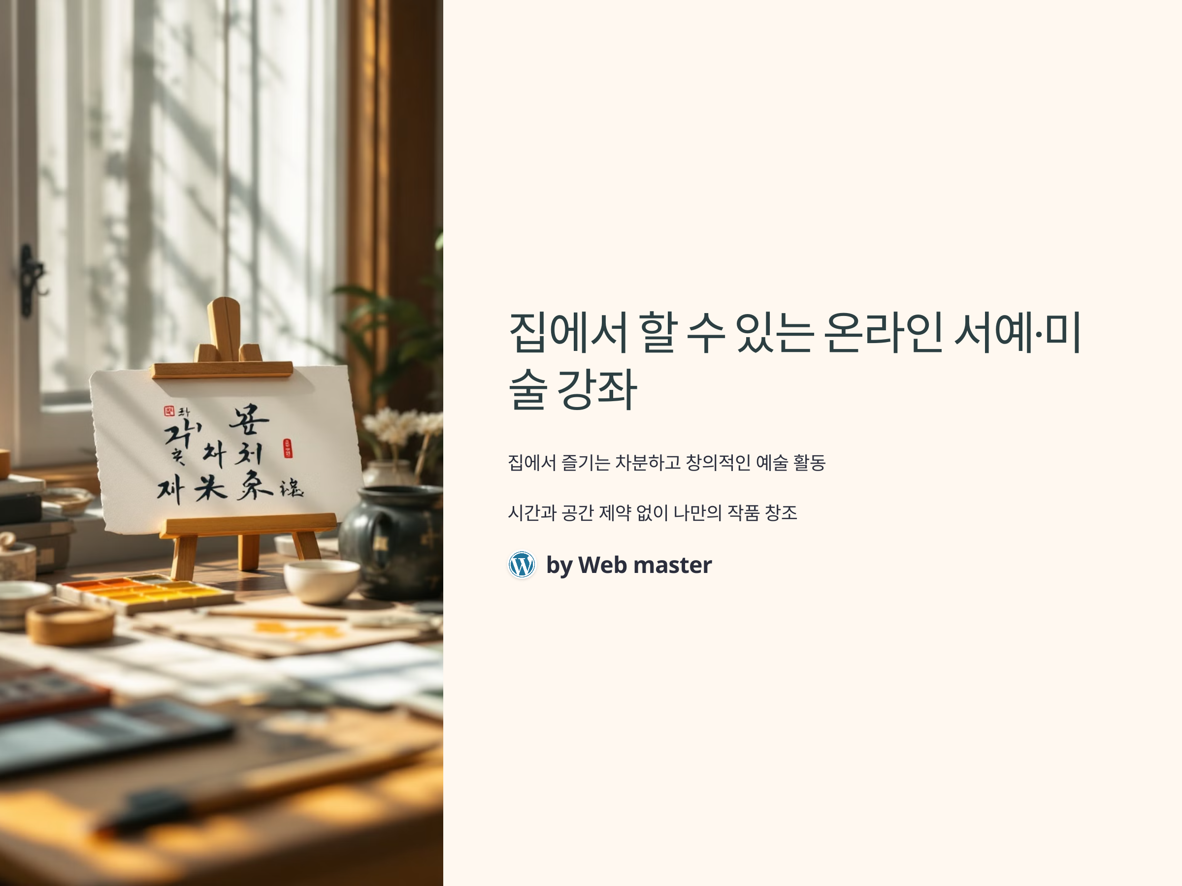 온라인 서예 및 미술 강좌는 누구나 손쉽게 접근할 수 있는 좋은 학습 방법입니다. 자기만의 예술 작품을 만들어 가는 과정은 창의력을 자극하며 스트레스를 해소하는 데에도 큰 도움이 됩니다. 서예와 미술을 배우고 싶다면, 나에게 맞는 강좌를 선택하여 꾸준히 실력을 키워보세요. 시간이 지나면, 그 누구도 따라올 수 없는 나만의 예술을 완성할 수 있을 것입니다.