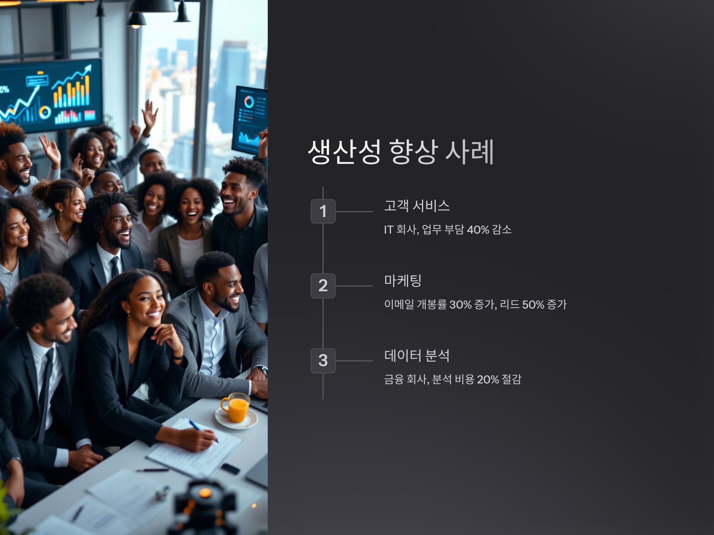 한 금융 회사는 챗GPT를 활용해 데이터 분석 업무를 자동화하고, 직원들이 더 창의적이고 전략적인 업무에 집중할 수 있도록 했습니다. 결과적으로 이 회사는 데이터 분석 비용을 20% 절감하면서도, 정확한 분석 결과를 얻을 수 있었습니다.