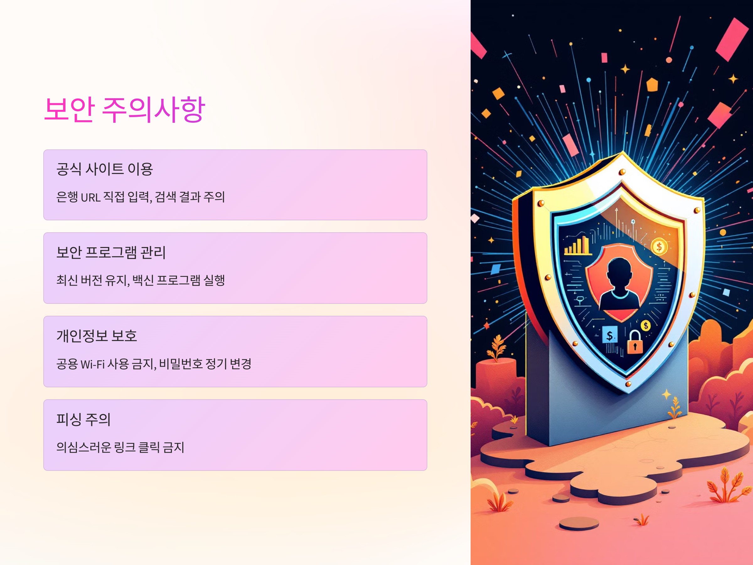 - 공개된 네트워크 사용 금지: 공용 Wi-Fi에서는 금융 거래를 하지 말 것