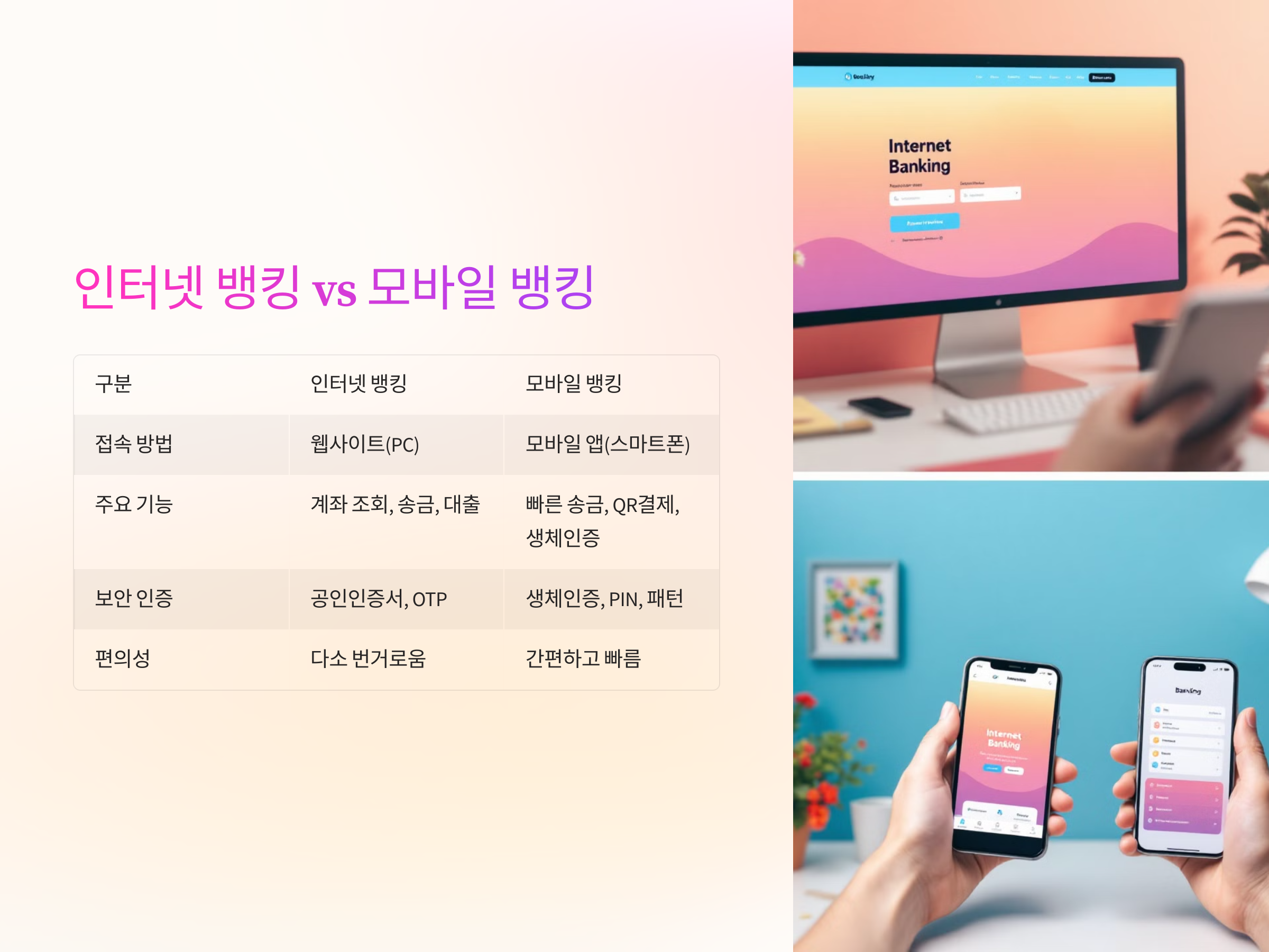 인터넷 뱅킹과 모바일 뱅킹은 기본적으로 같은 개념이지만, 사용 방식과 보안 체계에서 차이가 있습니다.