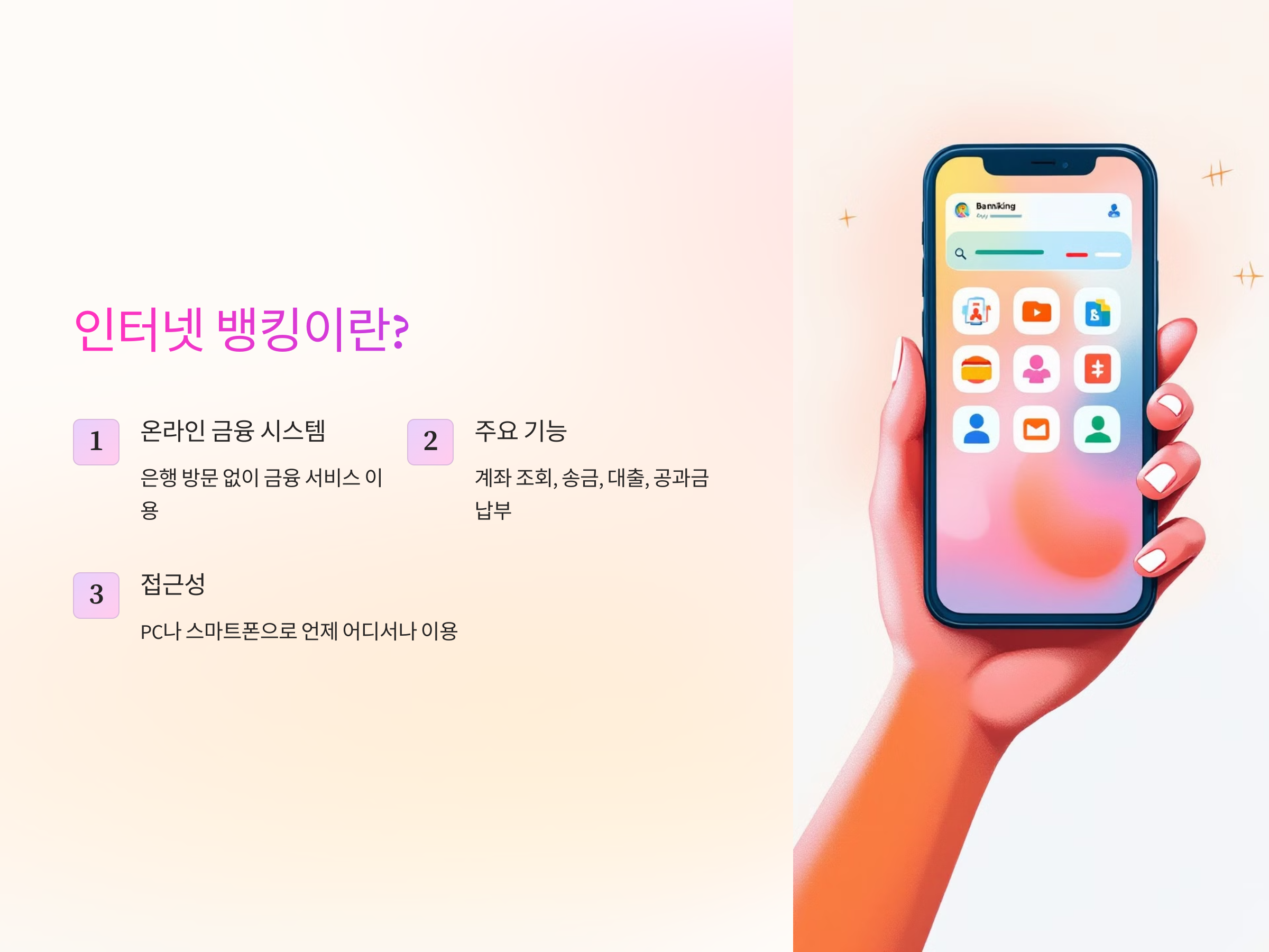 인터넷 뱅킹(Internet Banking)이란 은행 지점을 방문하지 않고도 온라인에서 금융 서비스를 이용할 수 있는 시스템입니다. PC나 스마트폰을 이용해 계좌 조회, 송금, 대출 신청, 공과금 납부 등을 할 수 있습니다.