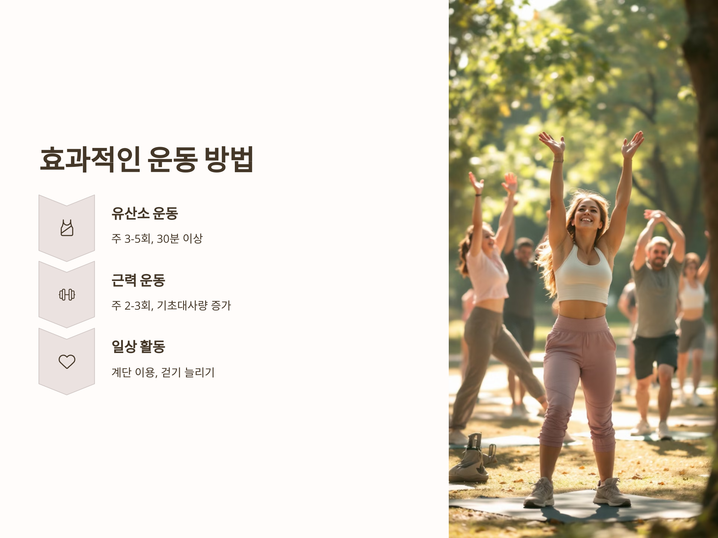 근력 운동은 근육량을 증가시켜 기초대사량을 높이는 데 도움이 됩니다. 기초대사량이 높아지면, 아무 활동을 하지 않아도 더 많은 칼로리가 소모됩니다. 또한, 근력 운동은 체중 감량을 돕는 중요한 운동입니다. 헬스장에서 덤벨이나 바벨을 이용한 운동 외에도, 스쿼트, 푸시업, 플랭크와 같은 자가 운동도 충분히 효과적입니다. 일주일에 2-3회 정도 근력 운동을 병행하세요.