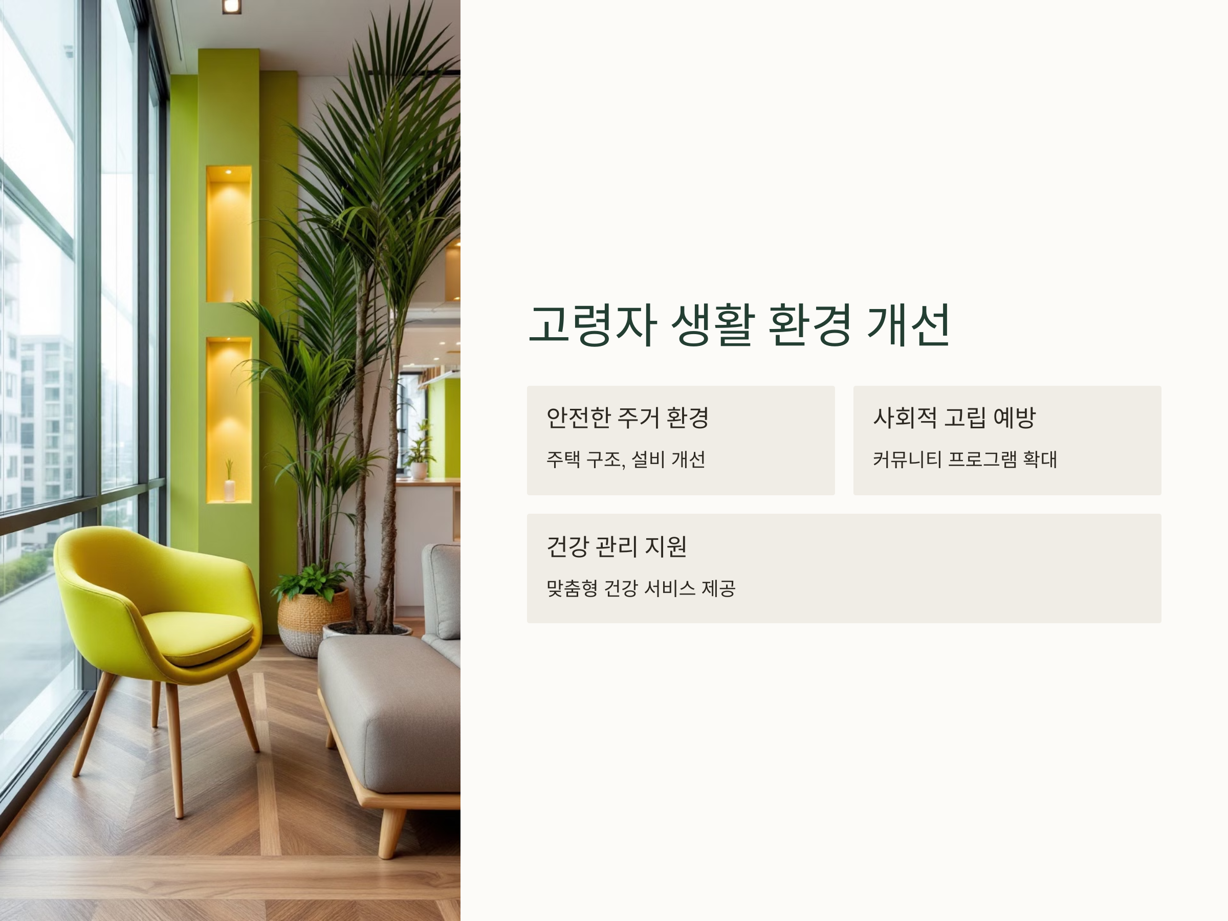 고령자들의 생활 환경을 개선하는 것도 중요한 문제입니다. 많은 고령자들이 현재 노후 생활을 하기 위해 주택을 보유하고 있지만, 일부는 주거 환경이 열악하거나 독거노인이 되어 외로움을 느끼기도 합니다. 이에 대한 대책은 무엇일까요?