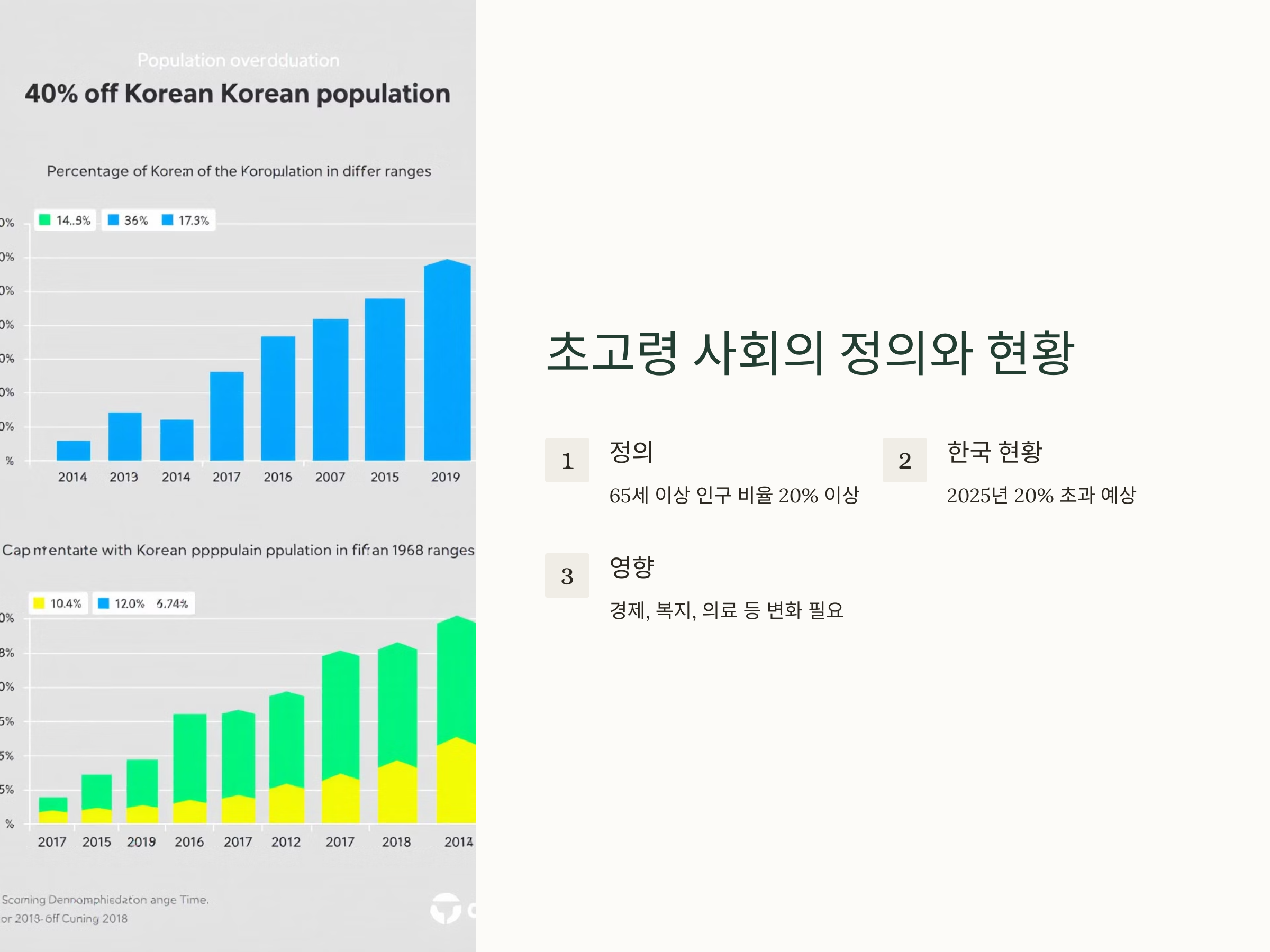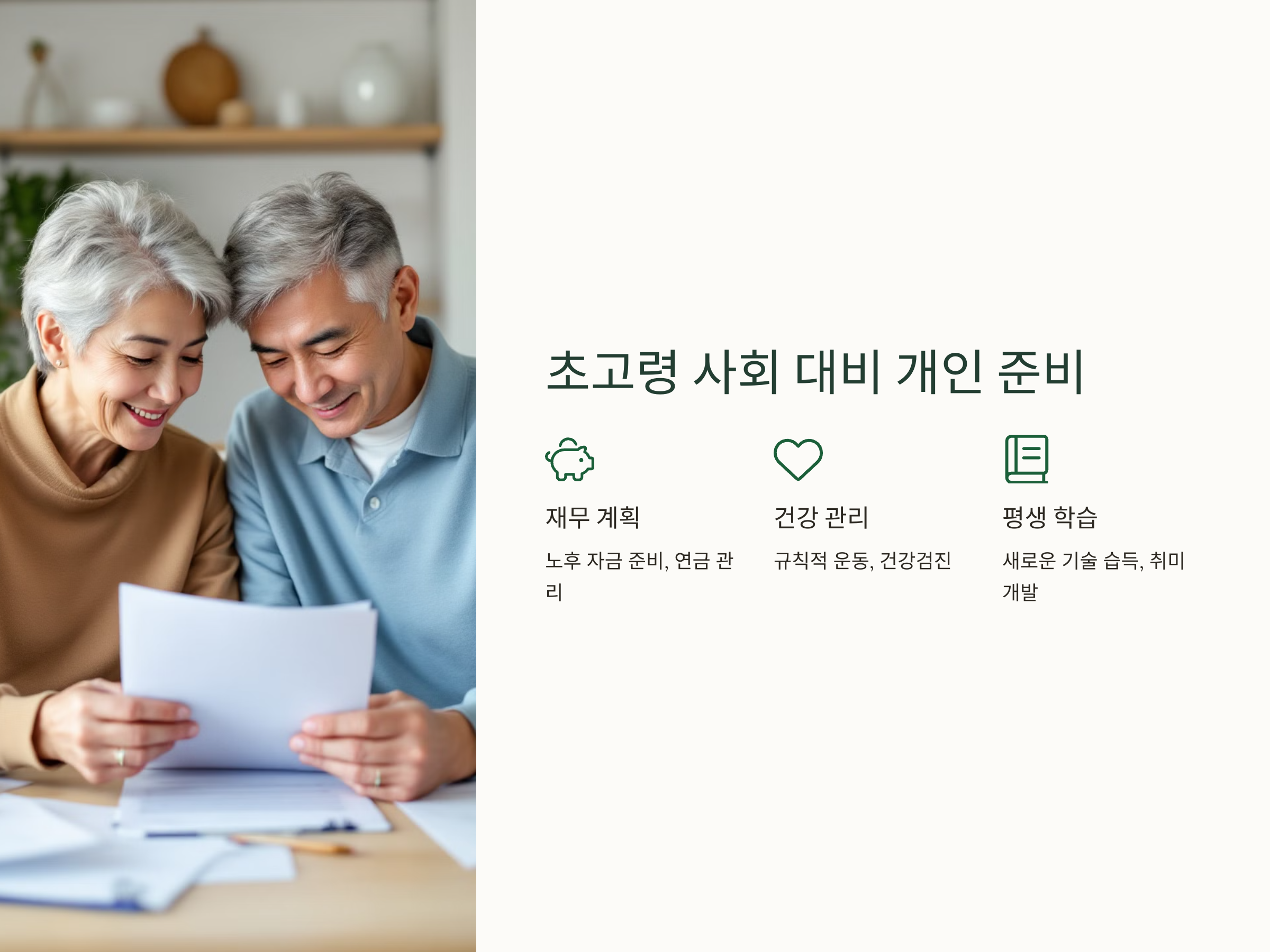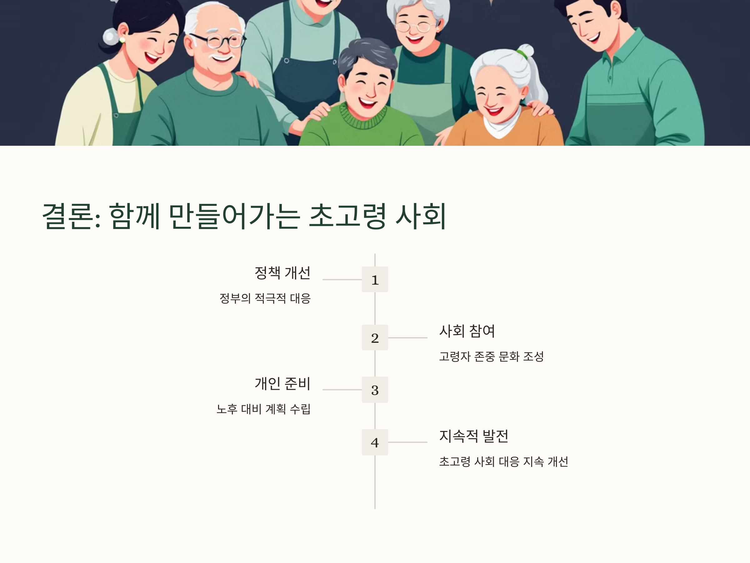초고령 사회로의 진입은 더 이상 먼 미래의 이야기가 아닙니다. 현재 대한민국은 전 세계적으로도 빠르게 고령화가 진행되고 있으며, 이는 곧 여러 사회적, 경제적 변화가 일어날 수 있음을 의미합니다. 이러한 변화에 우리가 어떻게 대응할 것인지가 중요한 시점입니다.