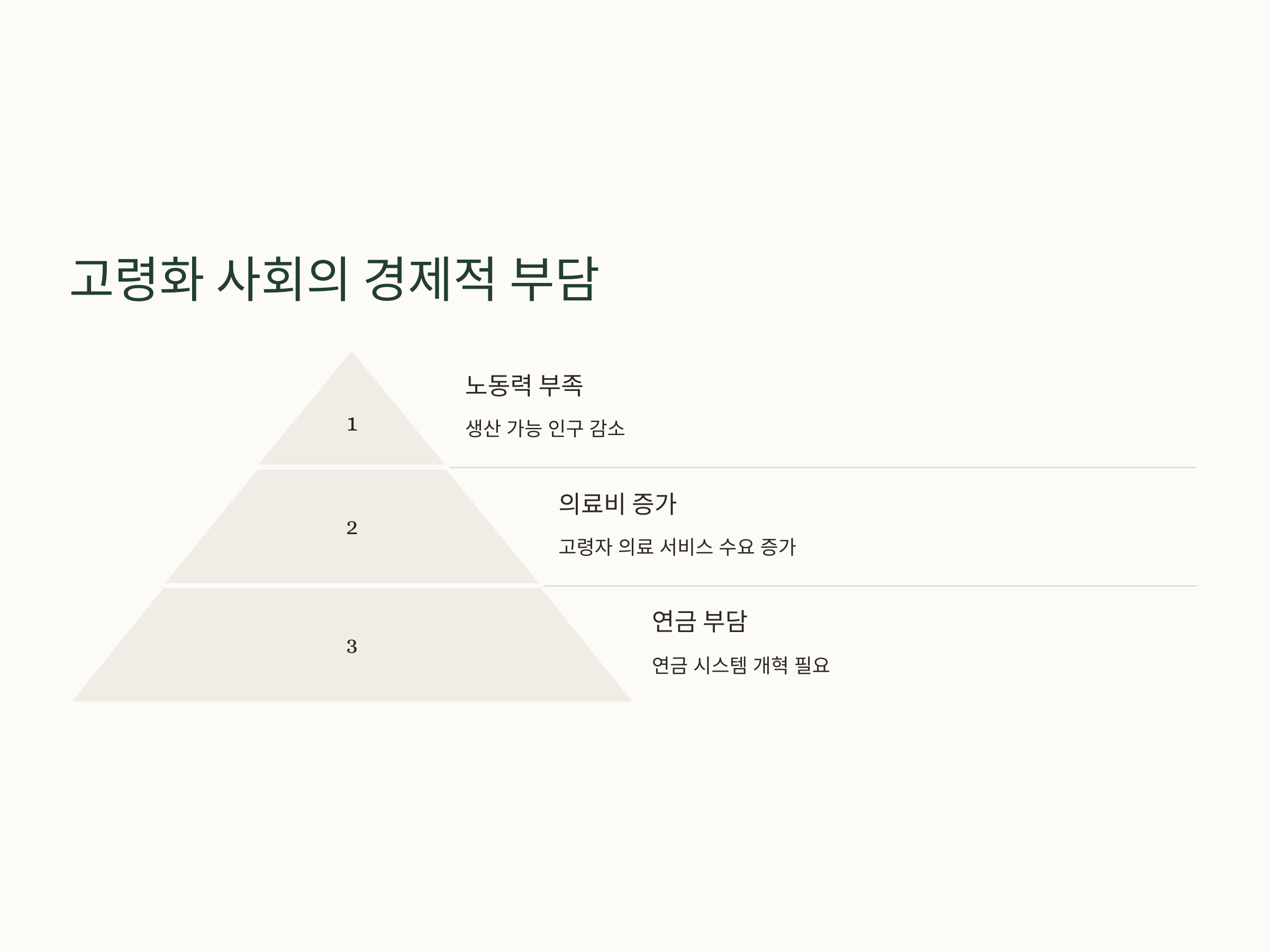 고령화가 진행되면서 나타나는 가장 큰 문제는 무엇일까요? 첫 번째는 경제적인 측면입니다. 고령 인구가 증가함에 따라 생산 가능 인구는 감소하고, 이에 따른 노동력 부족이 심화될 수 있습니다. 또한, 고령 인구는 의료 서비스와 복지 서비스를 더 많이 필요로 하기 때문에, 이에 대한 재정적 부담도 크게 늘어나게 됩니다.