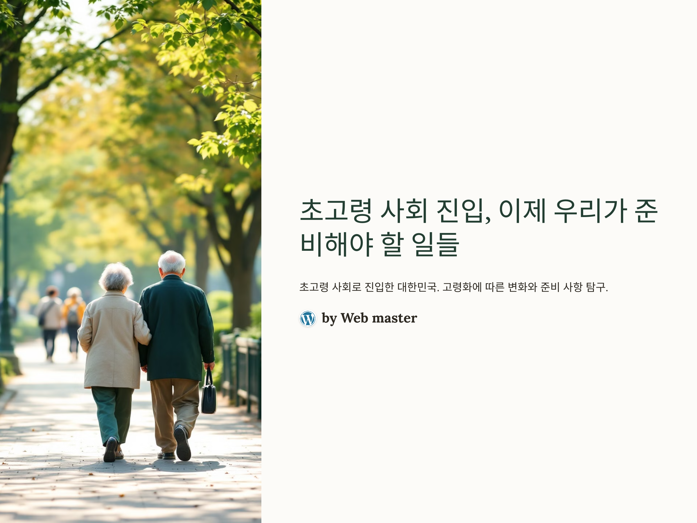 초고령 사회로 진입한 대한민국. 점차 많은 사람들이 고령화 사회에서 겪고 있는 변화와 어려움을 직접 경험하고 있습니다. 고령 사회가 확장됨에 따라, 우리는 앞으로 어떤 준비를 해야 할까요? 과연 우리의 삶과 사회는 어떤 영향을 받을 것이며, 이에 대응하기 위해서는 무엇을 준비해야 할까요? 이번 글에서는 초고령 사회로 가는 과정과 그에 따른 변화, 그리고 우리가 해야 할 준비를 알아보겠습니다.