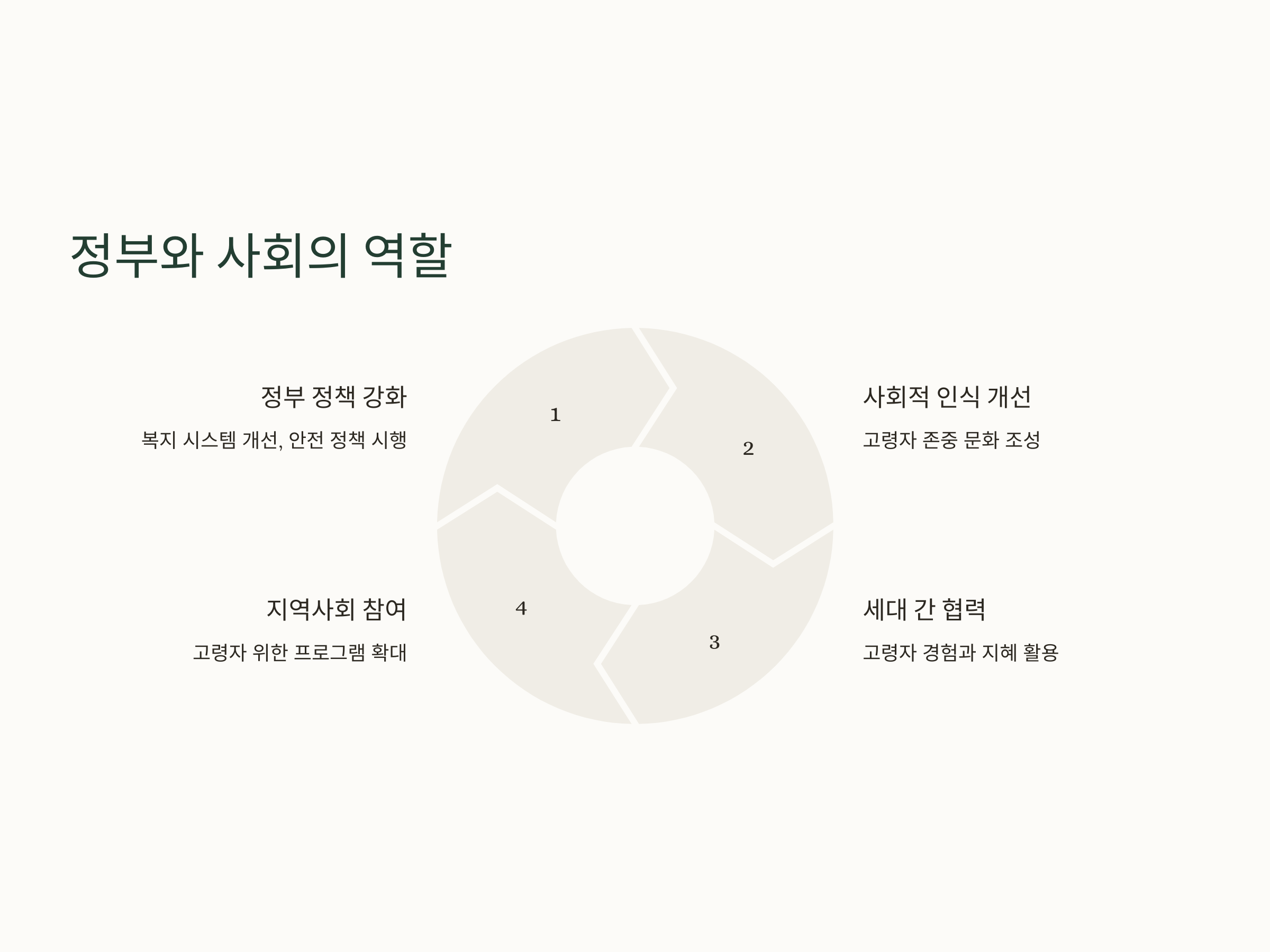 사회적인 차원에서도 고령자들의 삶의 질을 높이기 위한 노력이 필요합니다. 고령자들을 위한 다양한 커뮤니티와 프로그램을 확대하고, 이들이 사회에서 존중받을 수 있는 환경을 만들어가야 합니다. 또한, 젊은 세대가 고령자를 존중하고, 그들의 경험과 지혜를 활용할 수 있도록 교육하는 것도 중요합니다.